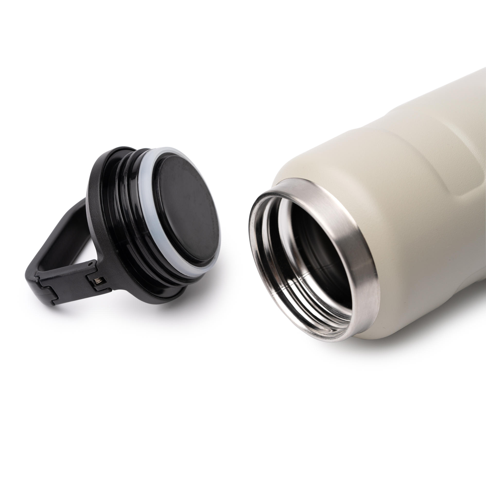 Bidón térmico de doble pared elaborado en acero inoxidable 304 reciclado en acabado mate. Capacidad de 550 ml. Tapón en negro con mosquetón incorporado en el asa de transporte.