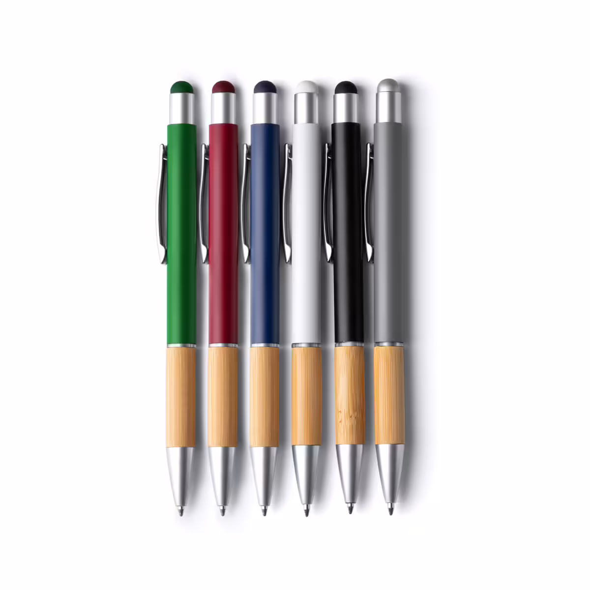 Bolígrafo metálico elegante en acabado mate con empuñadura de bambú y puntero táctil a conjunto. Disponible en diferentes colores.