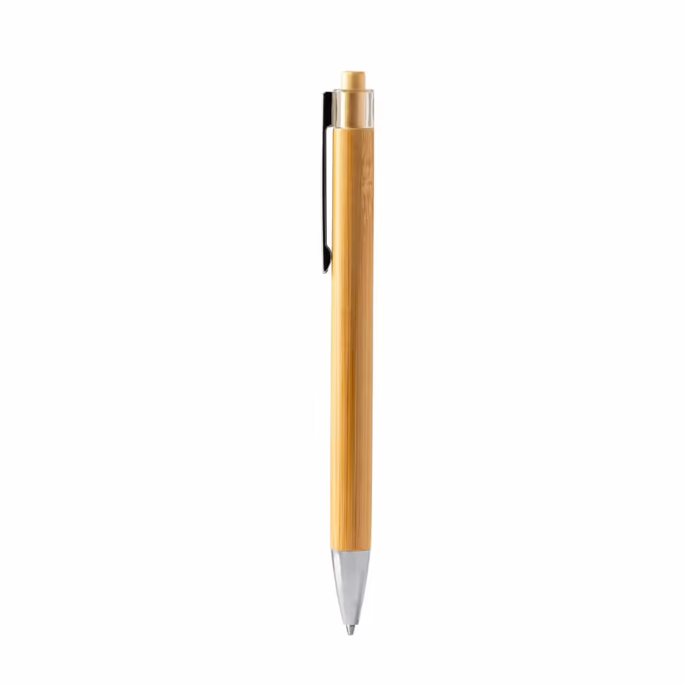 Bolígrafo con cuerpo y pulsador de bambú, clip metálico y detalles cromados. Tinta azul.