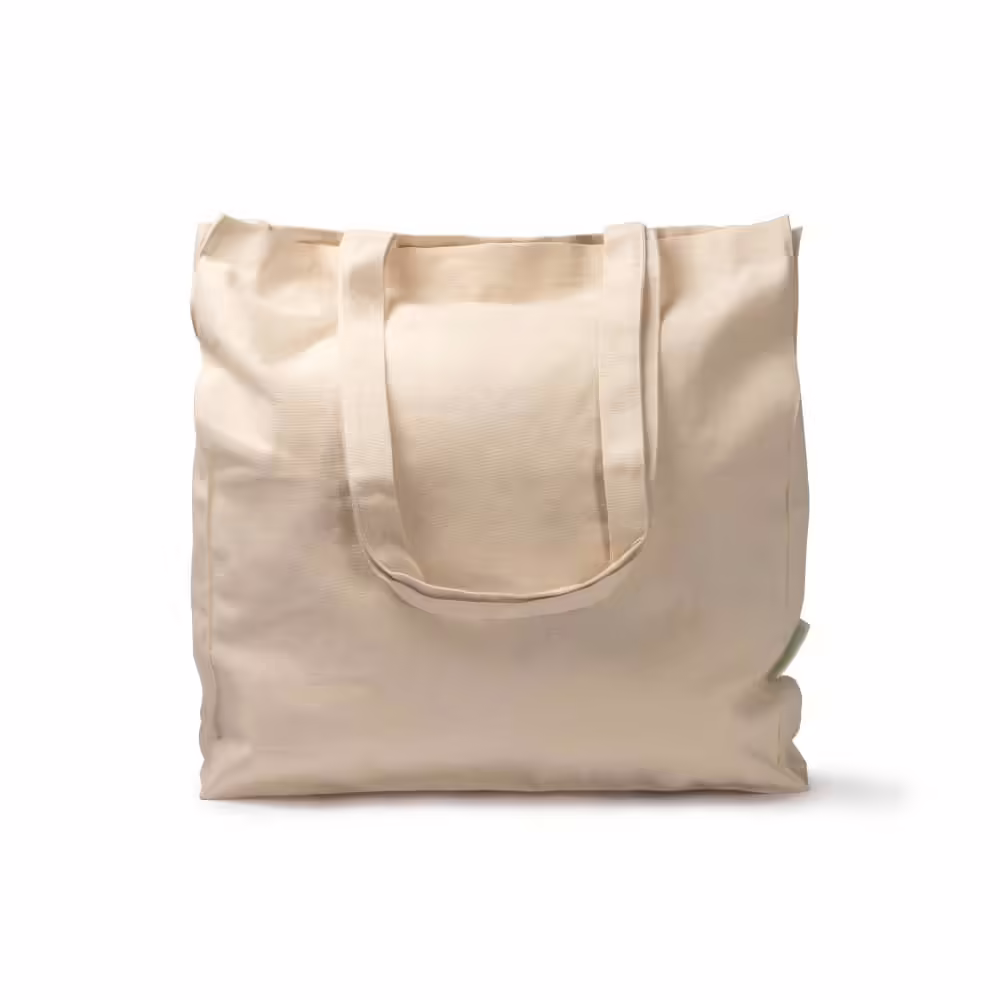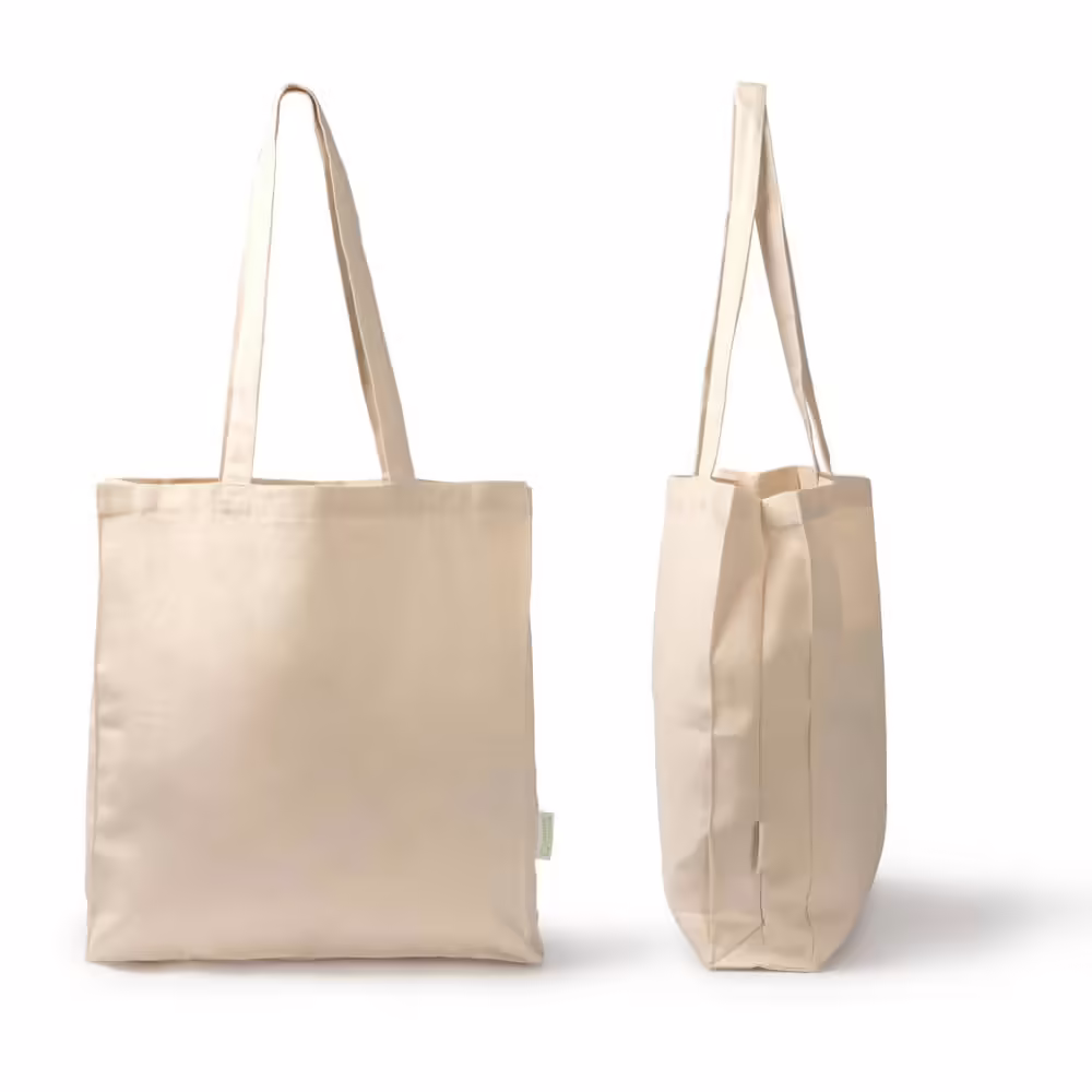 Bolsa 100% algodón orgánico de con fuelle en la base y laterales para hacerla en una opción adaptable y versátil para transportar tus enseres. Acabado natural con asas de 70 cm lo que la hace una opción práctica, cómoda y sostenible.