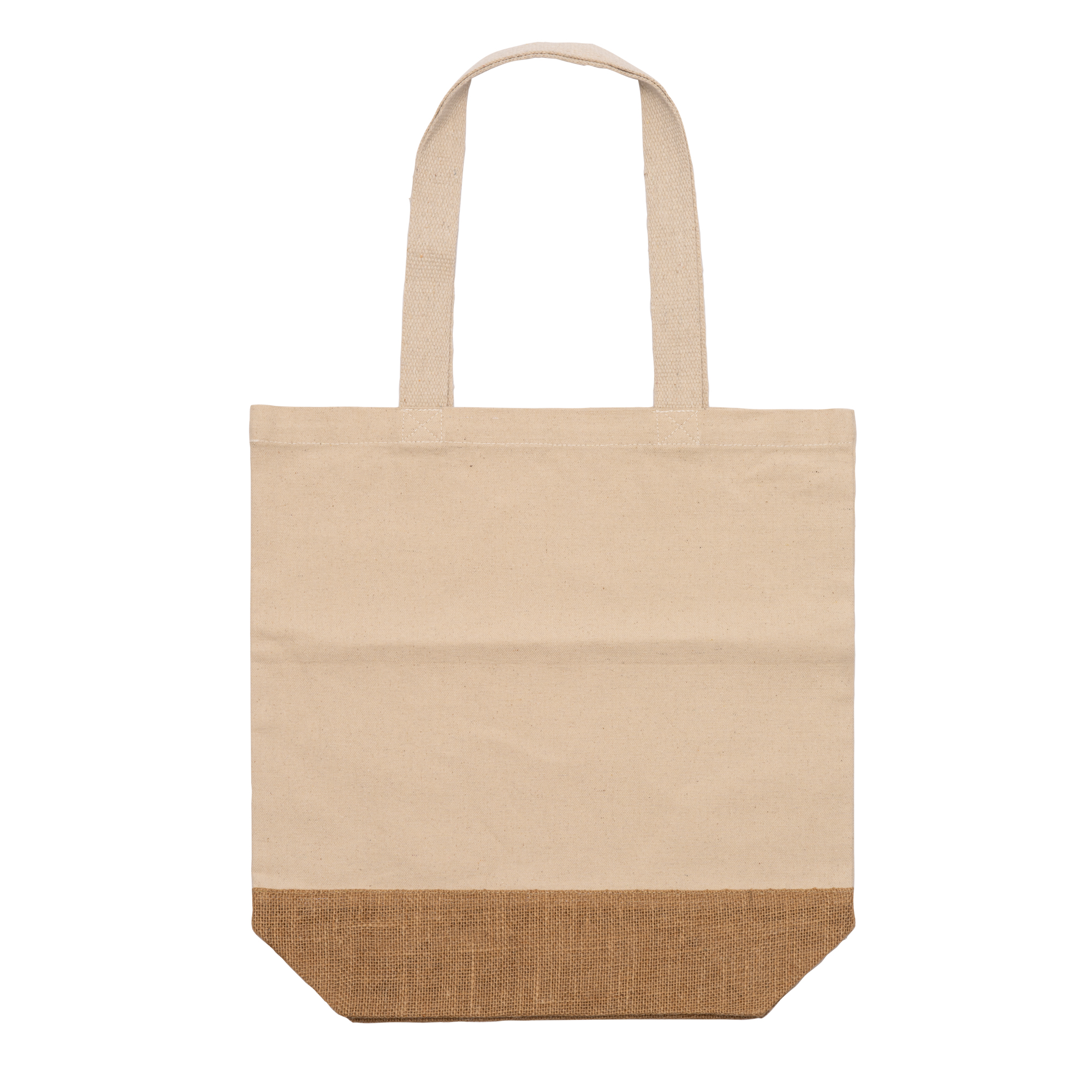 Bolsa realizada en algodón reciclado de 330 g/m² y yute natural por ambas caras. Cuenta con asas reforzadas de 70 cm para optimizar su transporte en su uso.