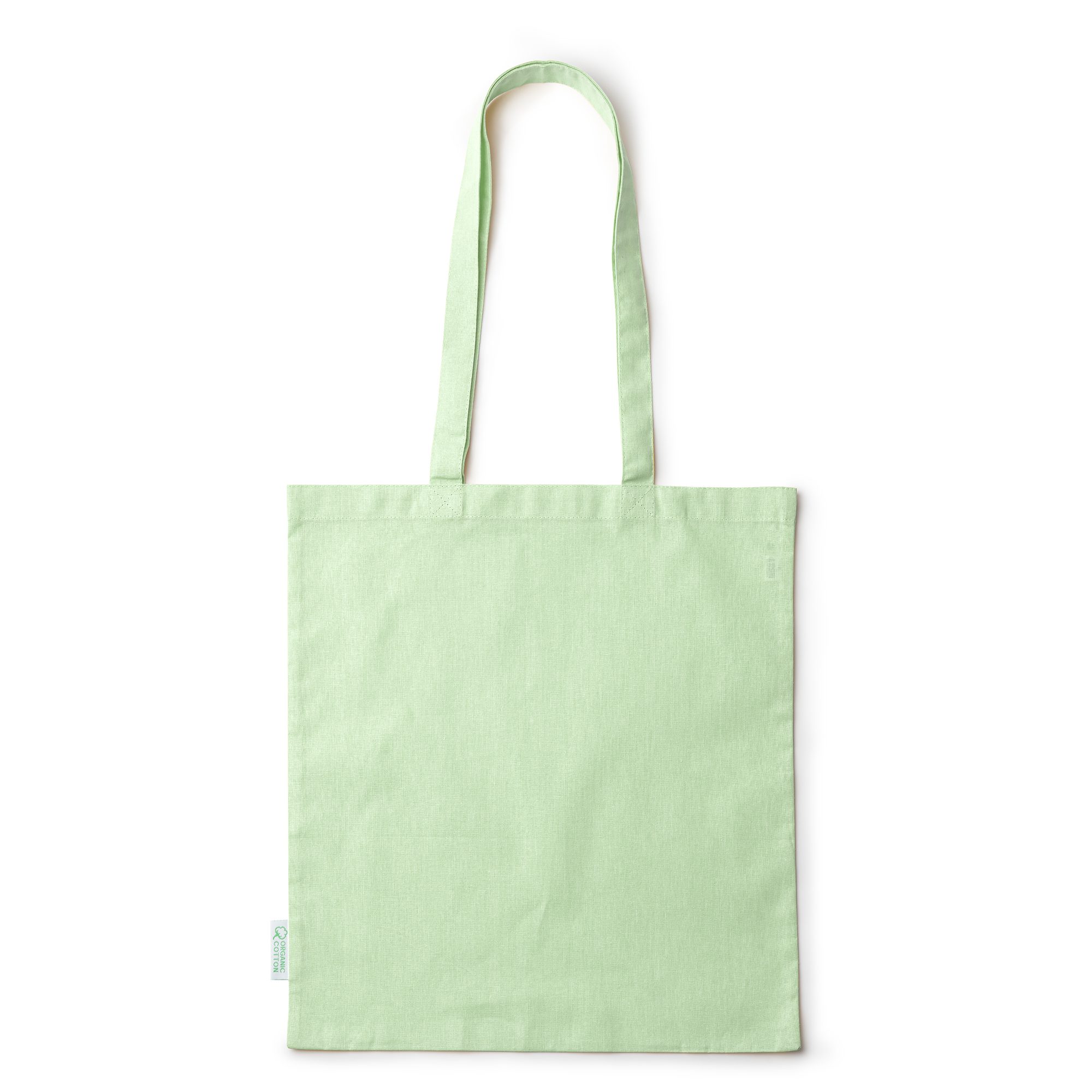 Bolsa 100% algodón orgánico de 140 g/m² con asas reforzadas largas de 70 cm.
