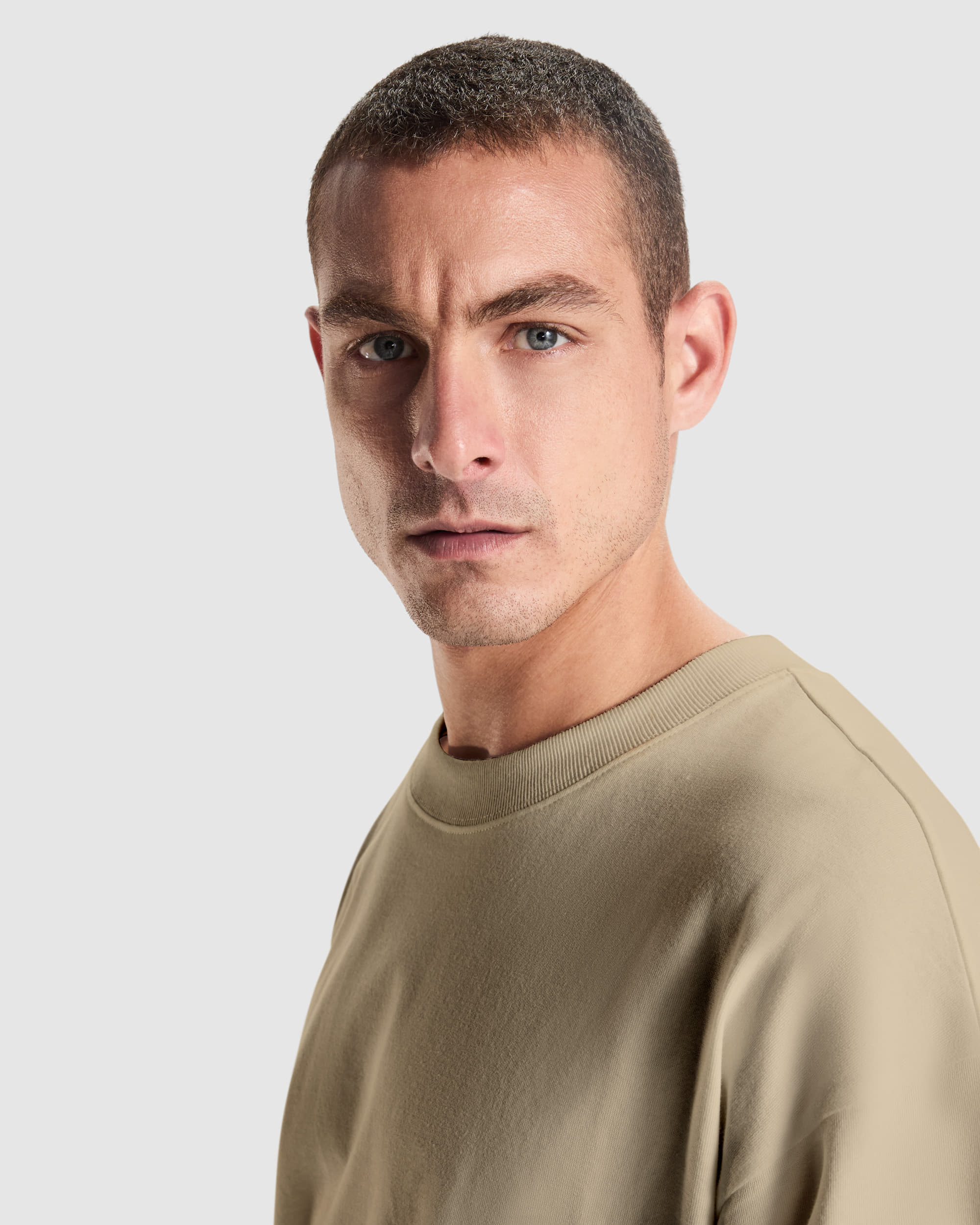 Camiseta gruesa de manga corta oversize. Cuello redondo en canalé 2×1 ancho. Cubrecosturas en cuello del mismo tejido. Doble costura ancha en bajo y mangas.