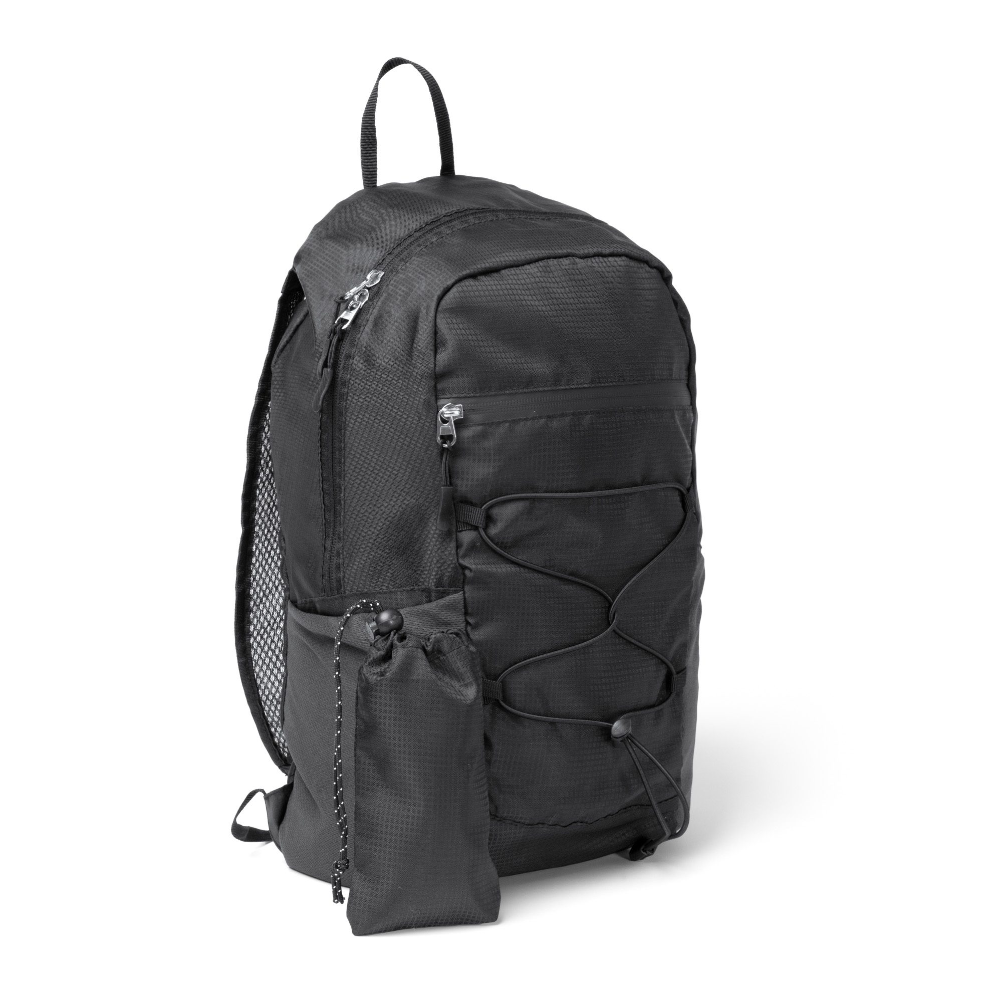 Mochila deportiva realizada en Ripstop RPET 420D. Con un compartimento principal con cierre de cremallera doble y bolsillo interior. Cuenta con dos compartimentos exteriores de rejilla y un compartimento frontal exterior con cierre de cremallera resistente al agua y cuerdas elástica. Además, incopora en su interior una bolsa con mosquetón para su guardado. Con asas elaboradas en material de rejilla.