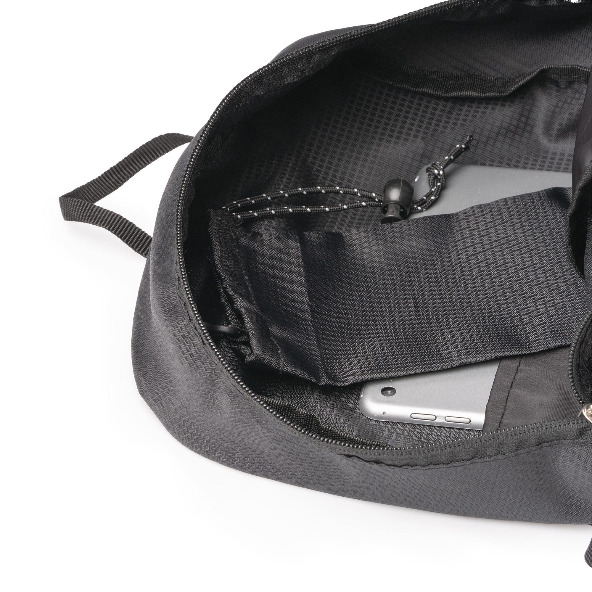 Mochila deportiva realizada en Ripstop RPET 420D. Con un compartimento principal con cierre de cremallera doble y bolsillo interior.
