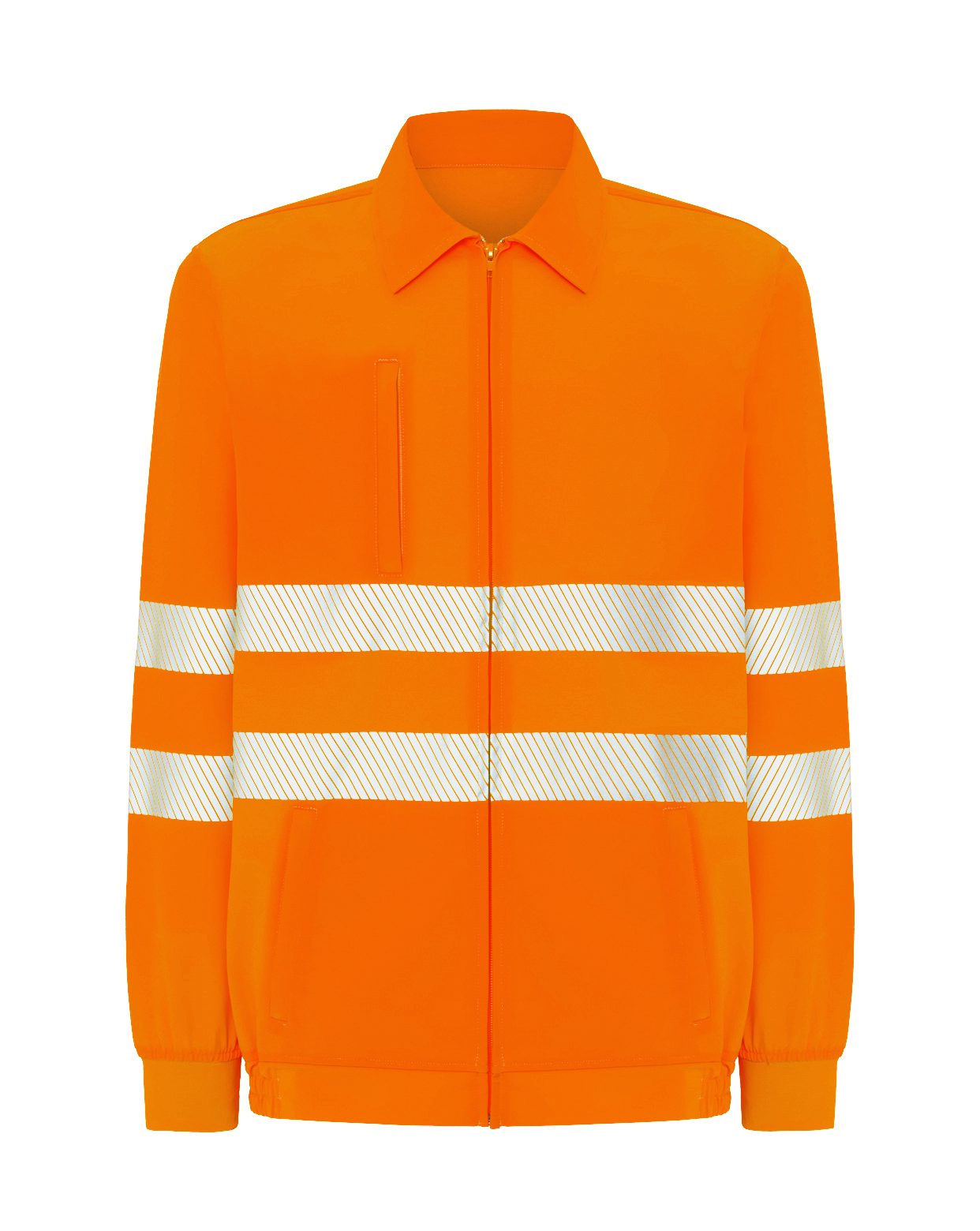 Cazadora.Características:Cierre central con cremallera.Dos cintas reflectantes segmentadas, termoselladas en torso y mangas.Cinturilla lateral elástica.Puños de canalé.3 bolsillos: 1 en pecho derecho y 2 laterales con cremalleras.