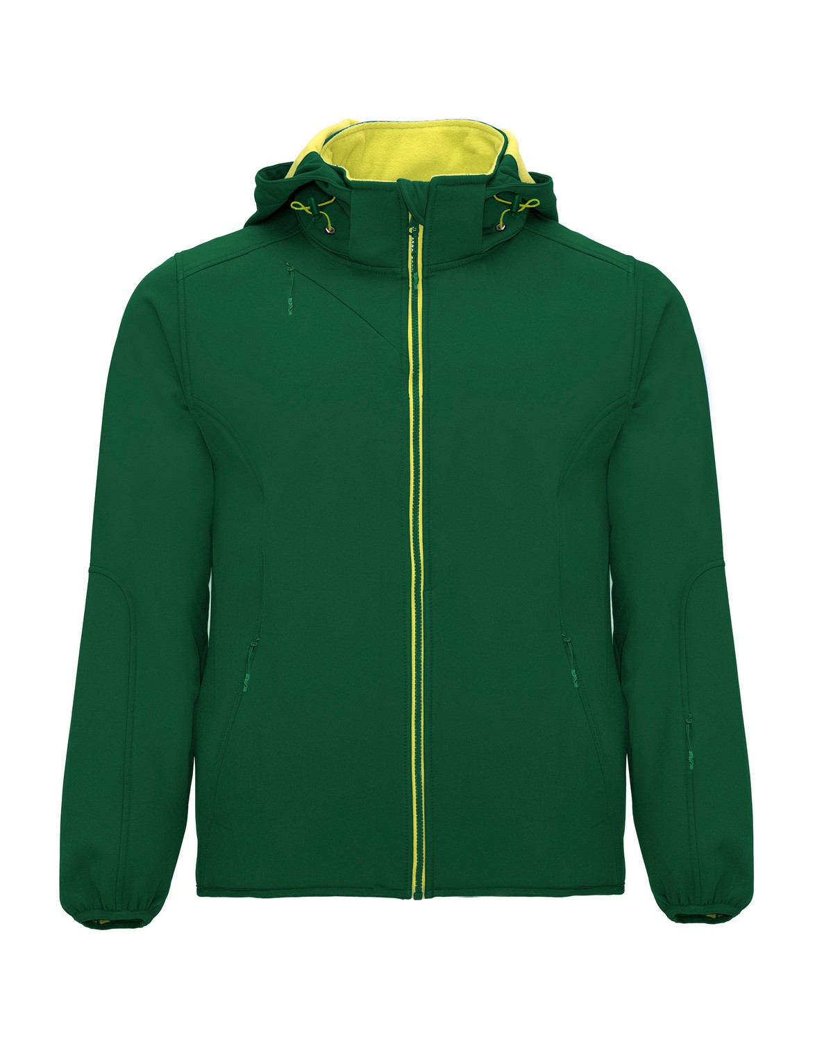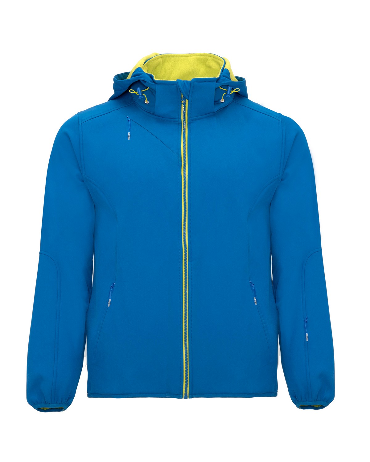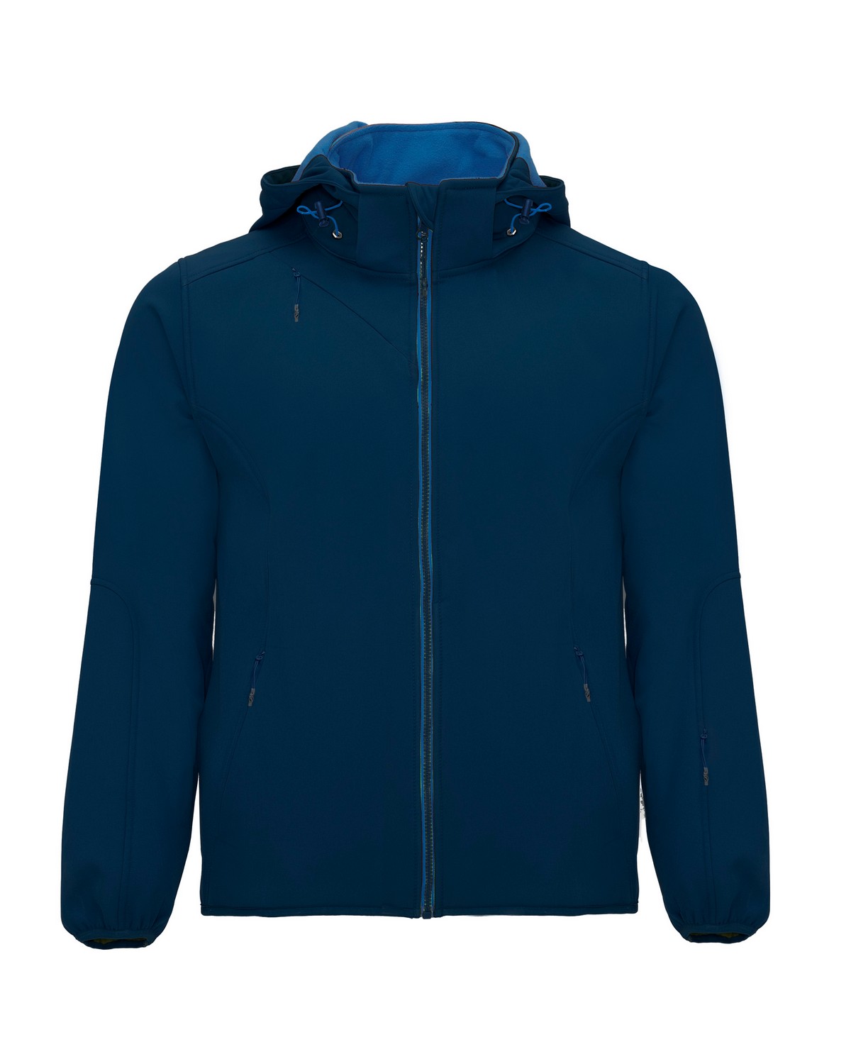 Softshell compuesto de 2 capas con corte deportivo. Cremallera central a contraste con protector de barbilla y tirador. Forro interior en tejido micropolar a contraste. Cuenta con bolsillo exterior en pecho derecho con cremallera invisible con forma diagonal, dos bolsillos exteriores laterales con cremallera invisible, y un bolsillo en manga izquierda. Ribete elástico a tono en puños y bajo. Capucha extraible con forro micropolar a constraste.