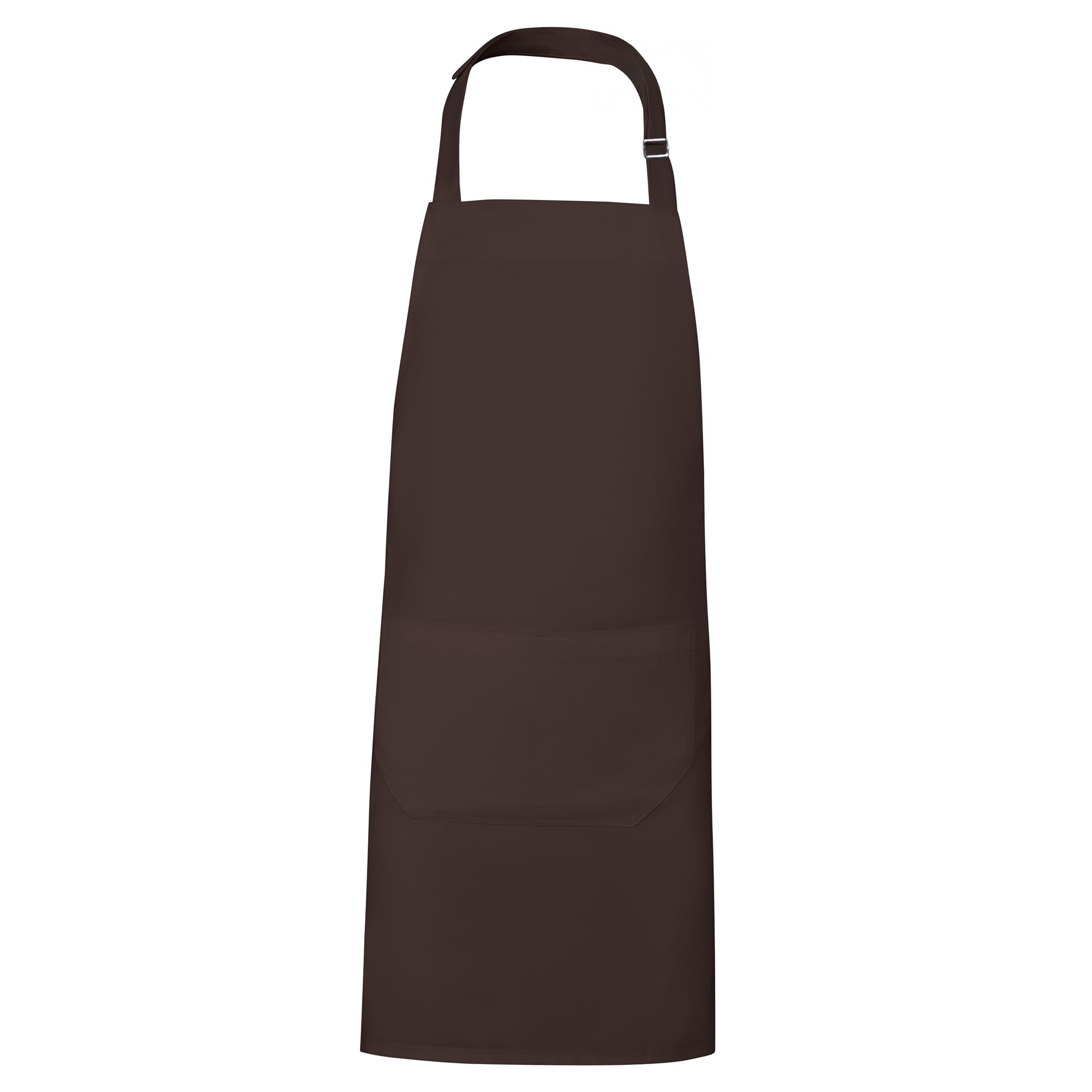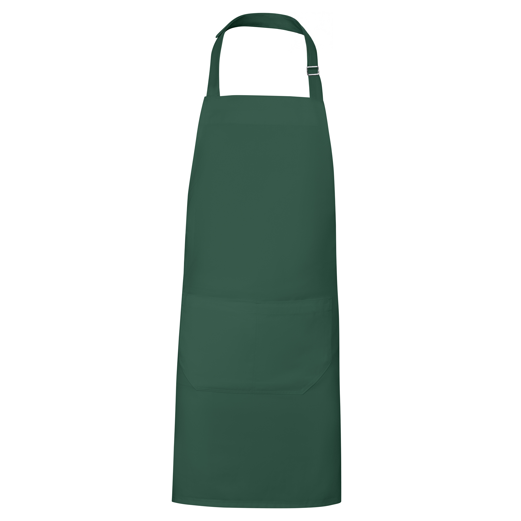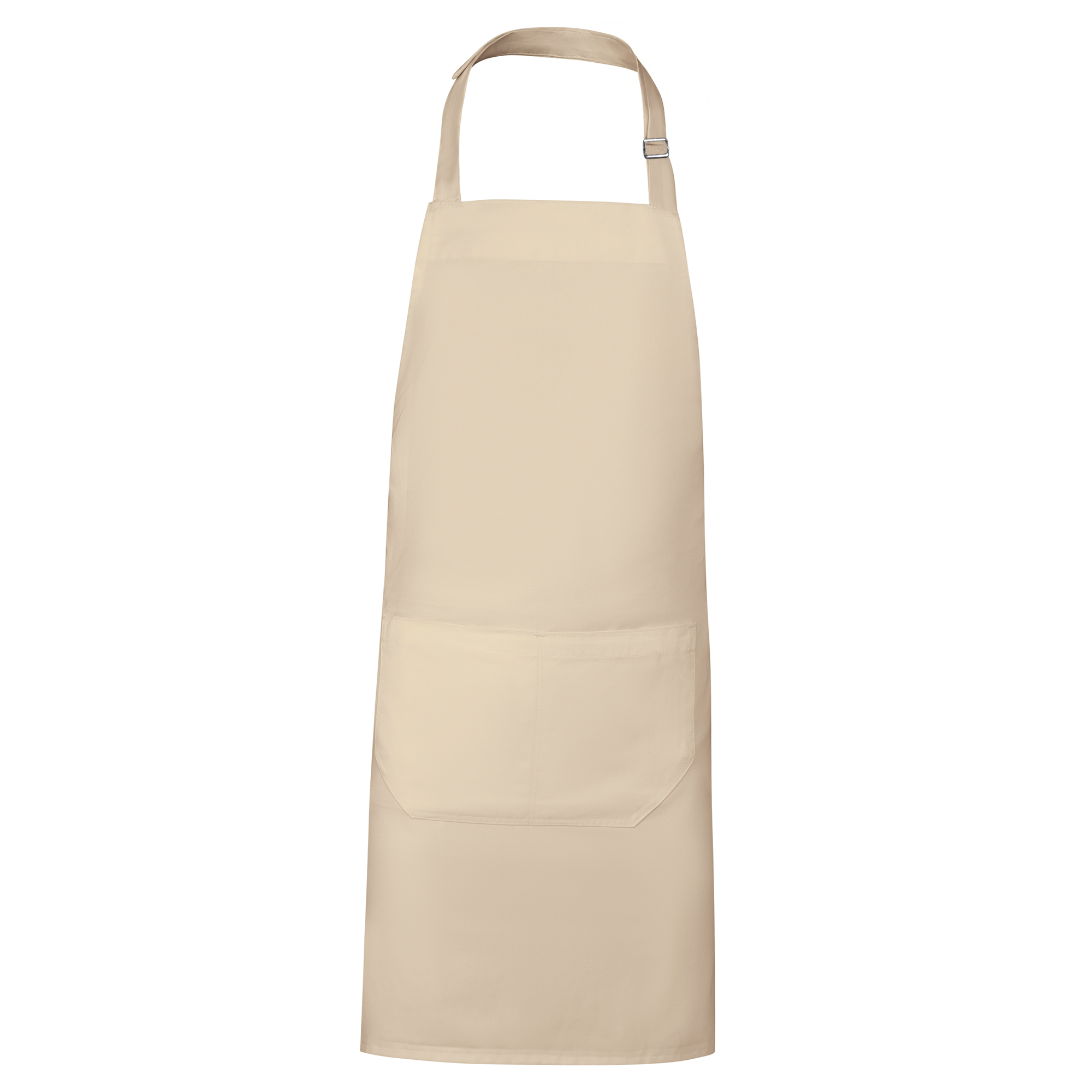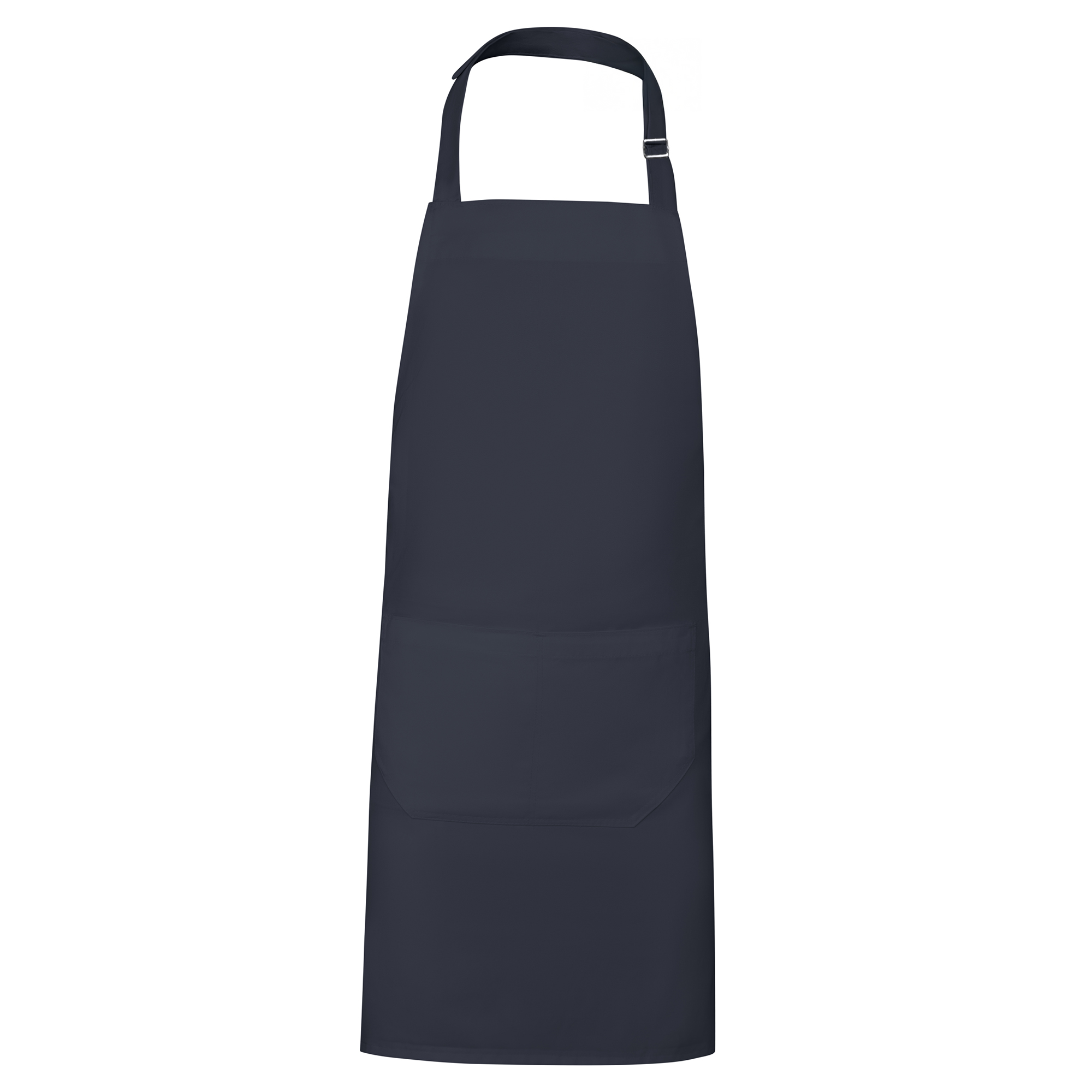 Delantal largo de sarga en poliéster reciclado y algodón reciclado. Tirante con cierre ajustador. Cintas laterales para lazada. Dos bolsillos frontales.