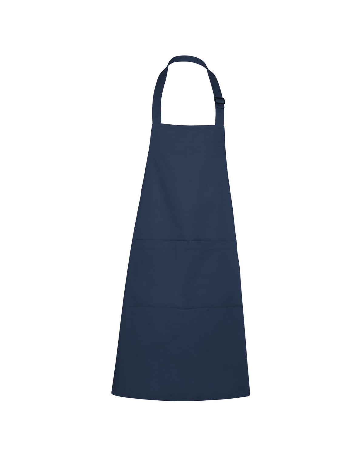 Delantal largo de sarga. Tirante con cierre ajustador de plástico. Cintas laterales para lazada. Bolsillo frontal con costura en el centro.