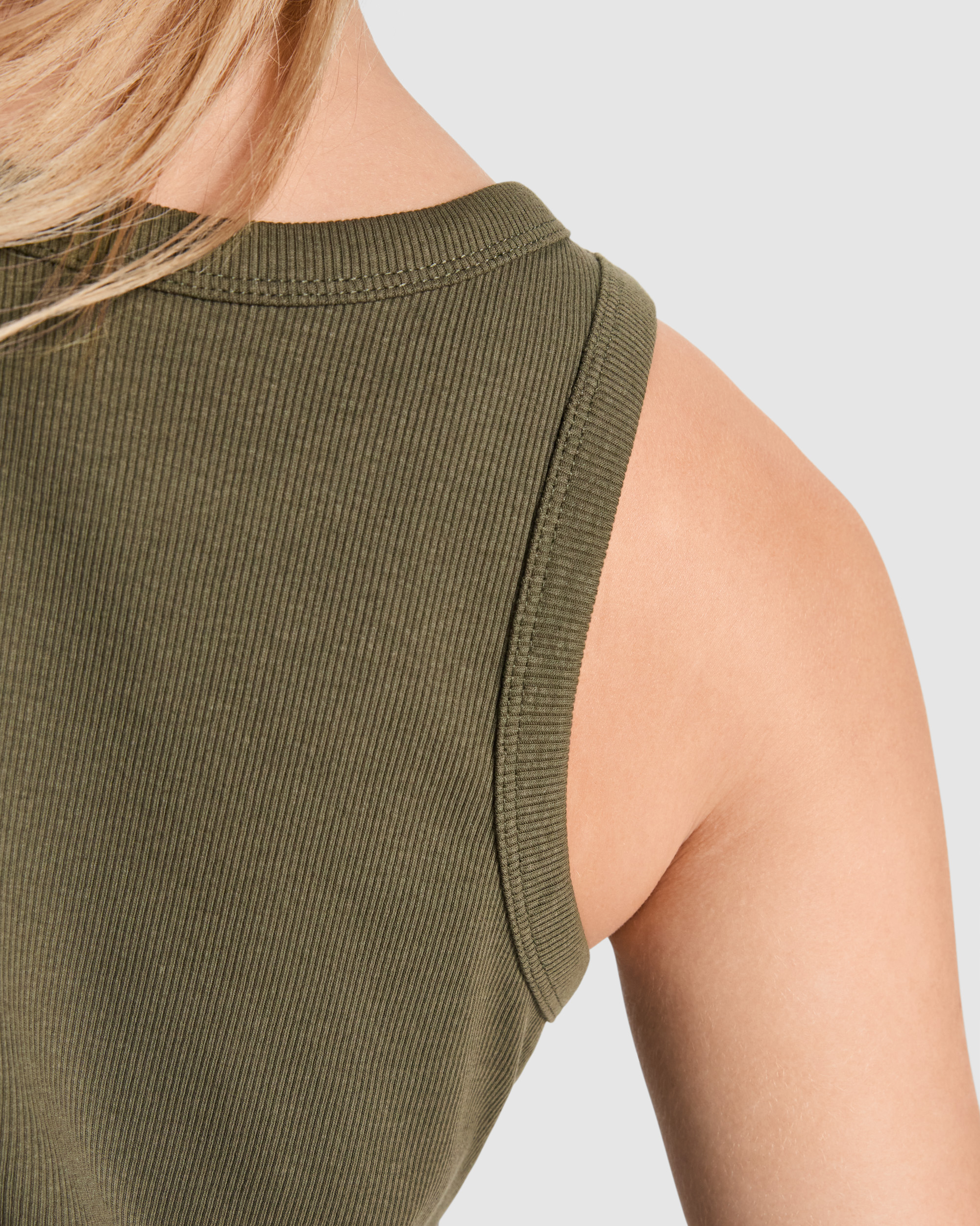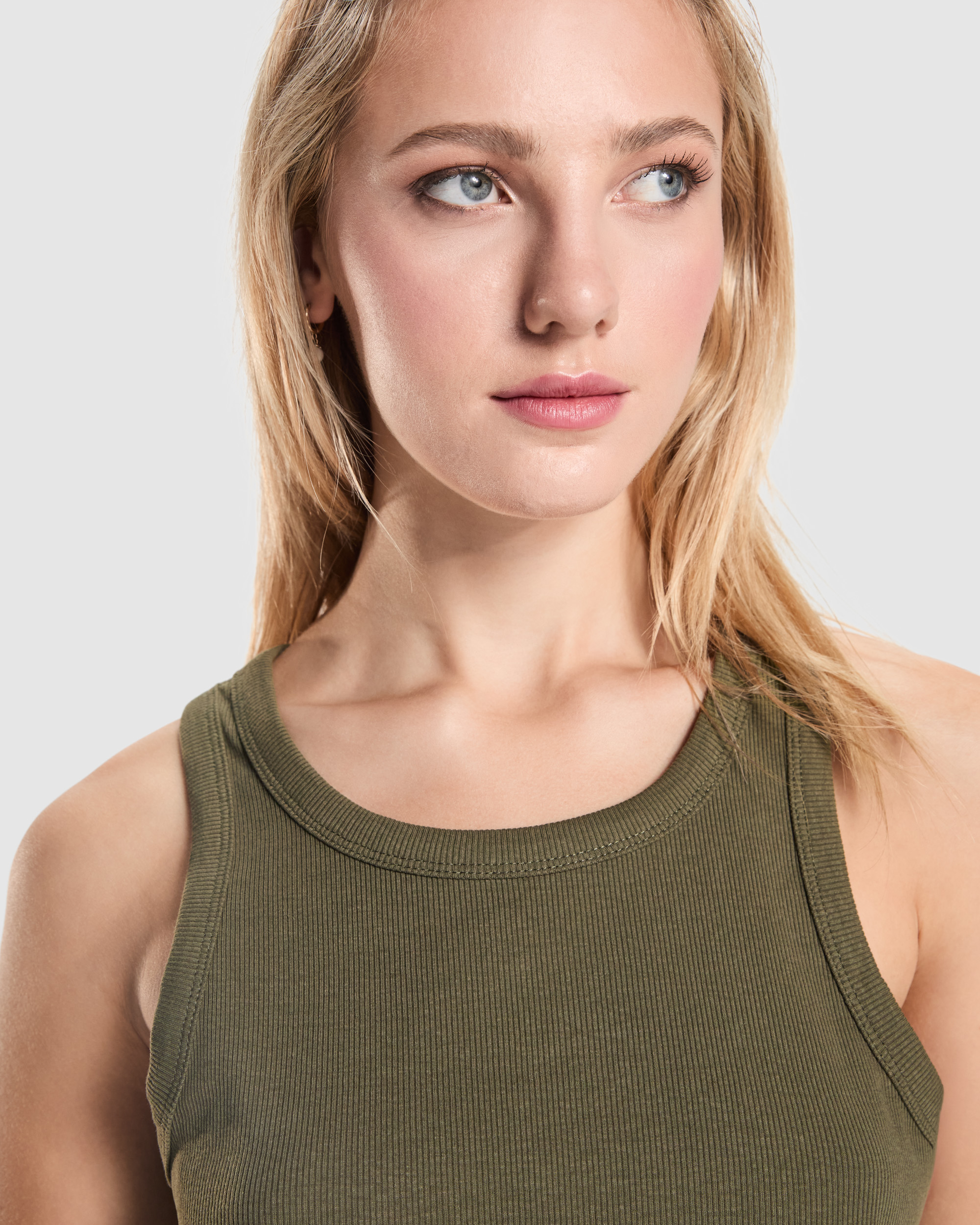 Camiseta de mujer sin mangas en punto canalé. Cuello y sisas con vivo ancho del mismo tejido, reforzado con doble costura. Bajo con doble costura.