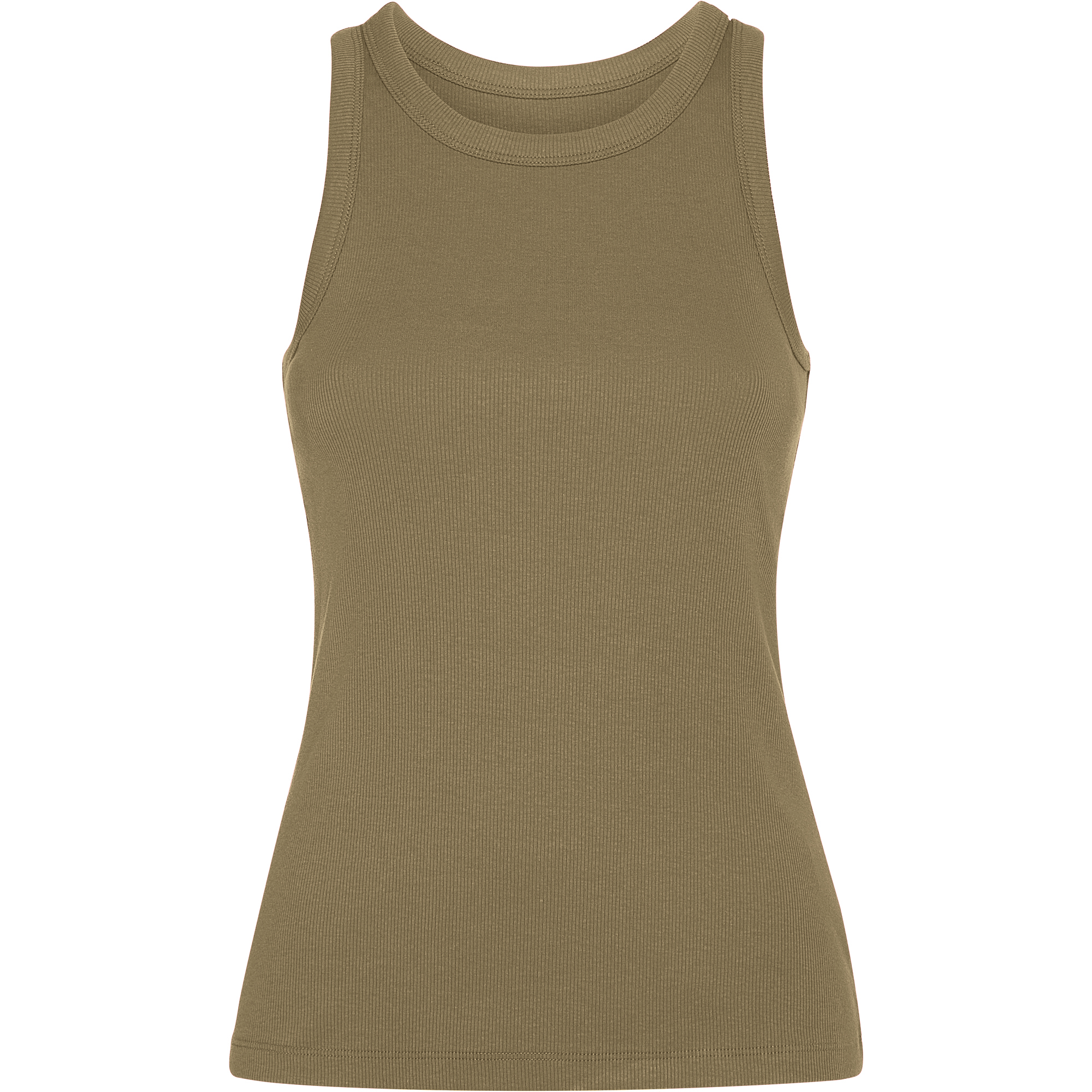 Camiseta de mujer sin mangas en punto canalé. Cuello y sisas con vivo ancho del mismo tejido, reforzado con doble costura.