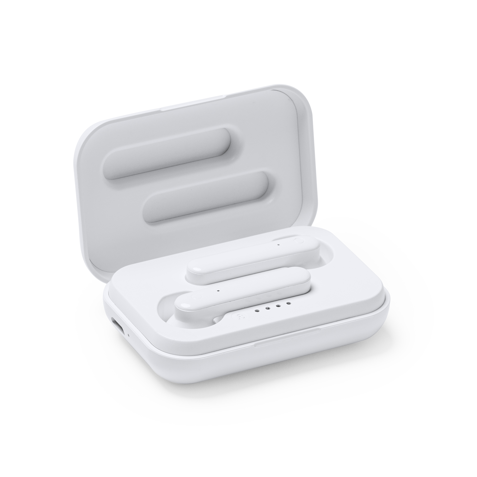 Auriculares inalámbricos con estuche con tapa. Cuenta con indicadores luminosos en auriculares y estuche, mostrando el nivel de carga de éste. También cuenta con función manos libres con botón multifunción táctil en el lateral de los auriculares para control de llamadas y función de asistente de voz mediante control multifunción. Reproducción de audio mediante conexión Bluetooth, control de pistas y volumen mediante botones laterales.