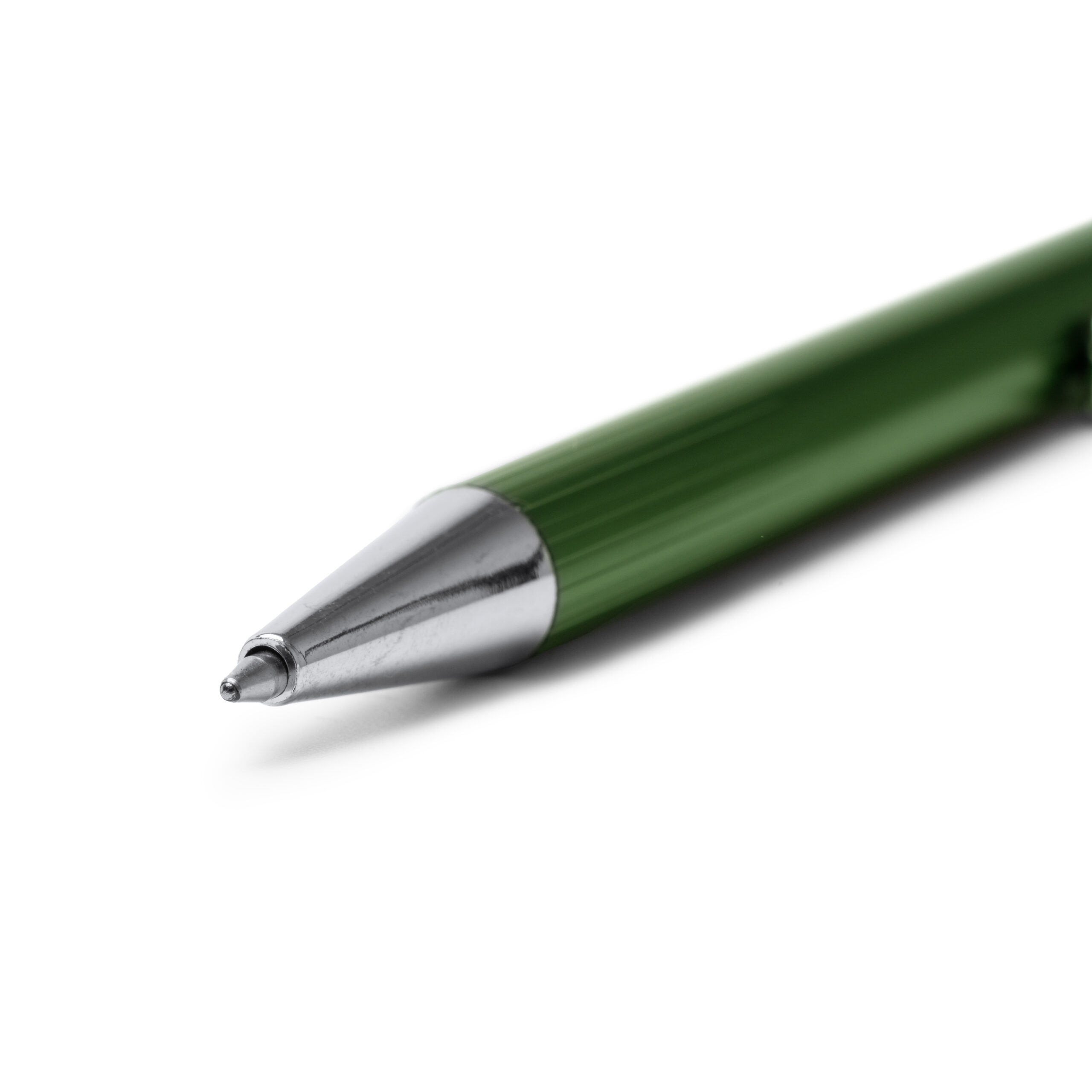 Bolígrafo de aluminio con agarre rayado en acabo metálico y puntero táctil. Detalles texturizados en empuñadura y pulsador.