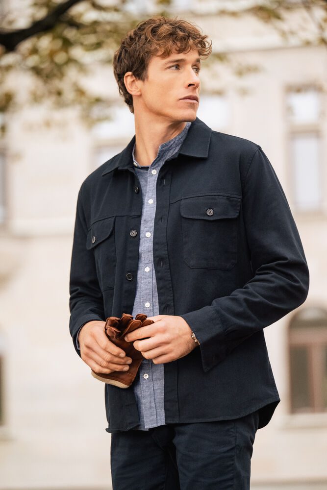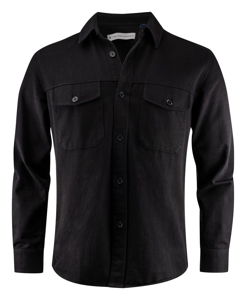 Camisa unisex en algodón de sarga, canesú en la espalda y botones en la parte delantera. Bolsillos de solapa en el pecho con botón. Mangas largas con tapeta y puños abotonados. Dobladillo inferior curvado.