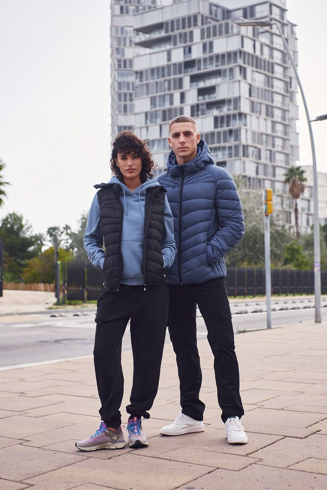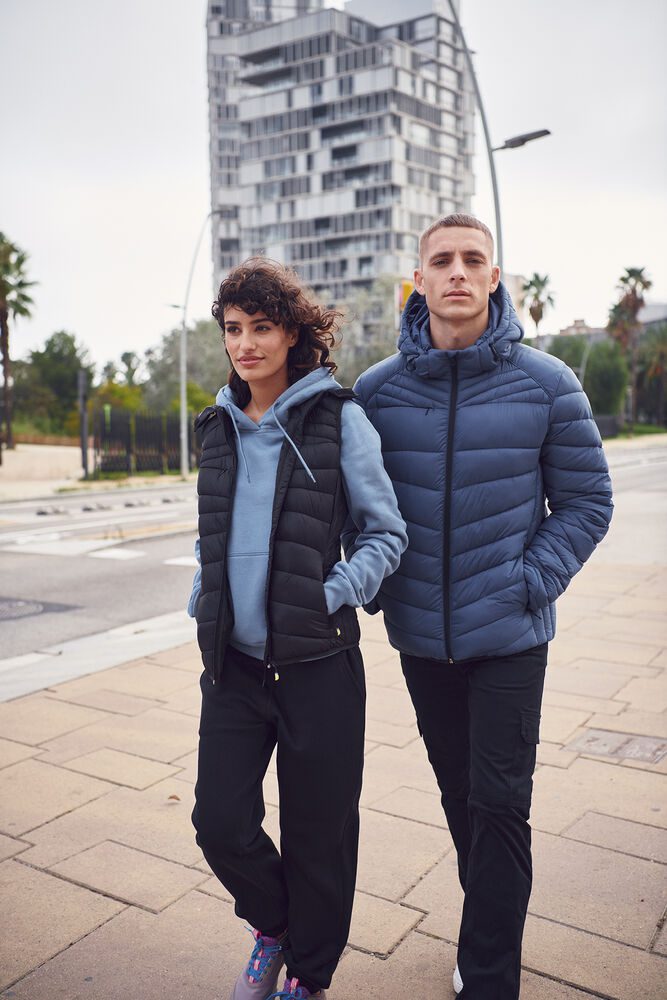 Chaqueta ligera cálida con acolchado similar al plumón. Hecho de 100% poliamida reciclada. Capucha desmontable, 3 bolsillos exteriores con cremallera y 2 bolsillos interiores. Cinta elástica en bajo y mangas. Viene con solución para auriculares y tiradores de cremallera.