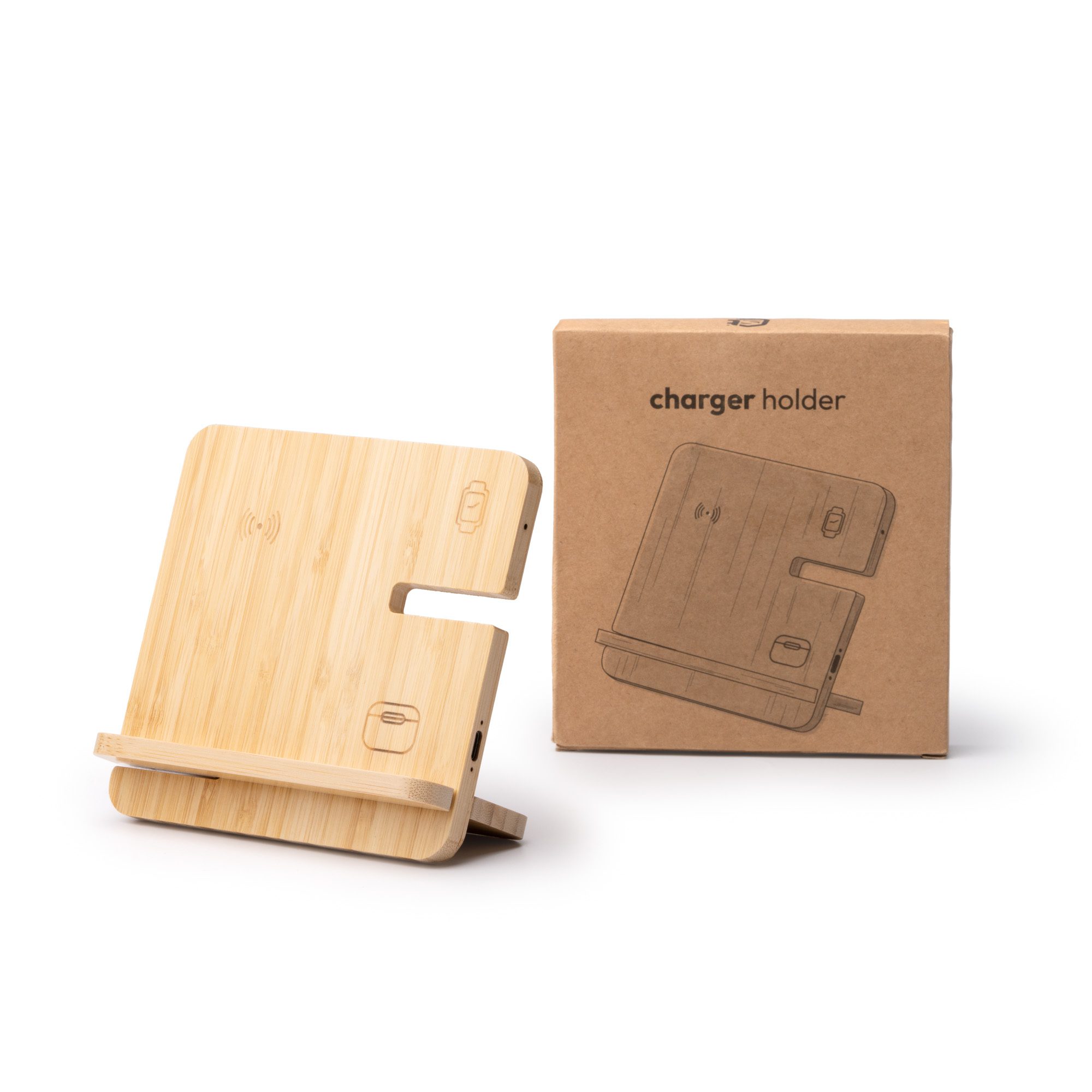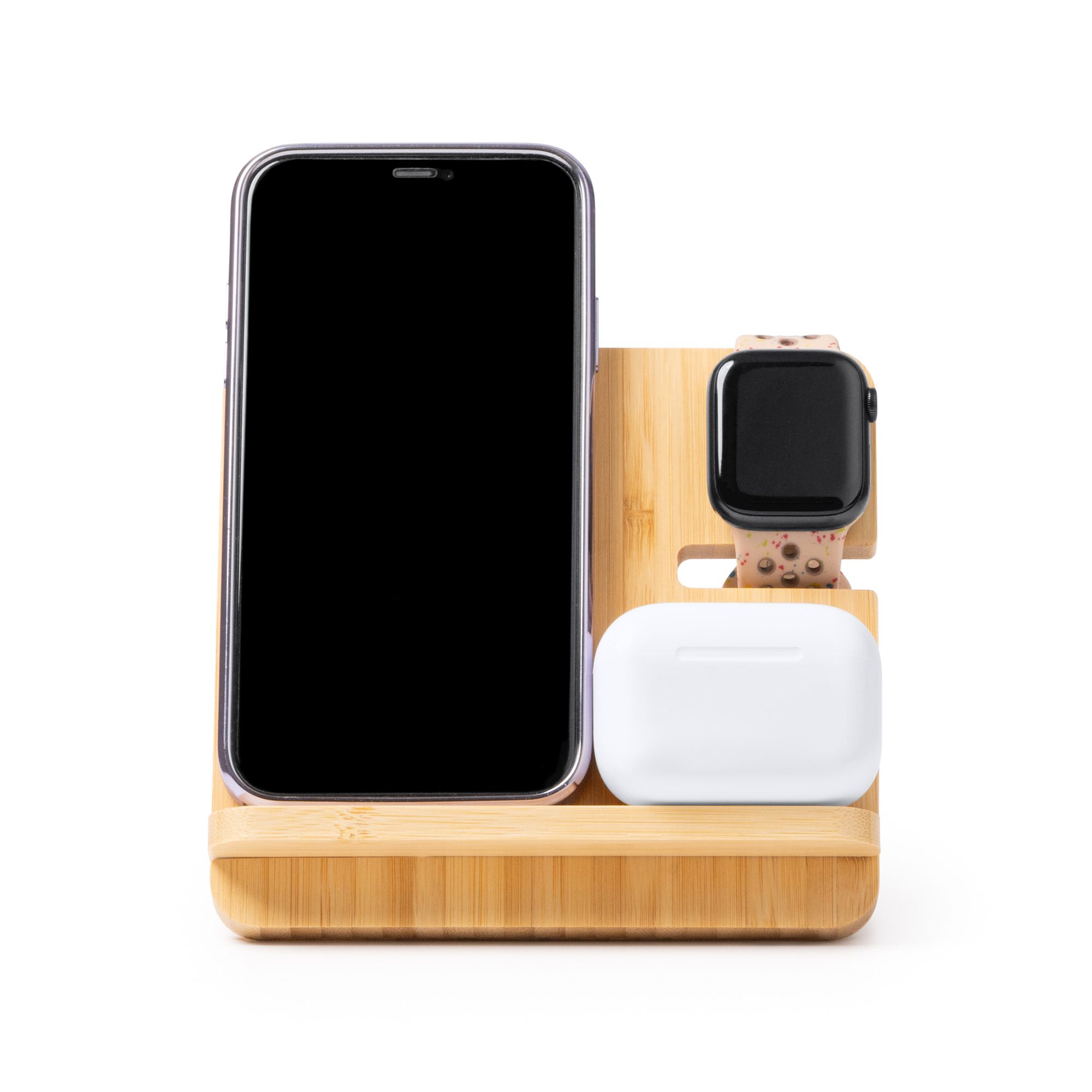 Soporte cargador vertical 3 en 1 realizado en bambú, con 15W de potencia. Función de carga para smartphones, smartwatches y auriculares inalámbricos. Con indicadores luminosos de carga. Con entrada Tipo C para conexión a corriente. Cable Tipo C incluido.