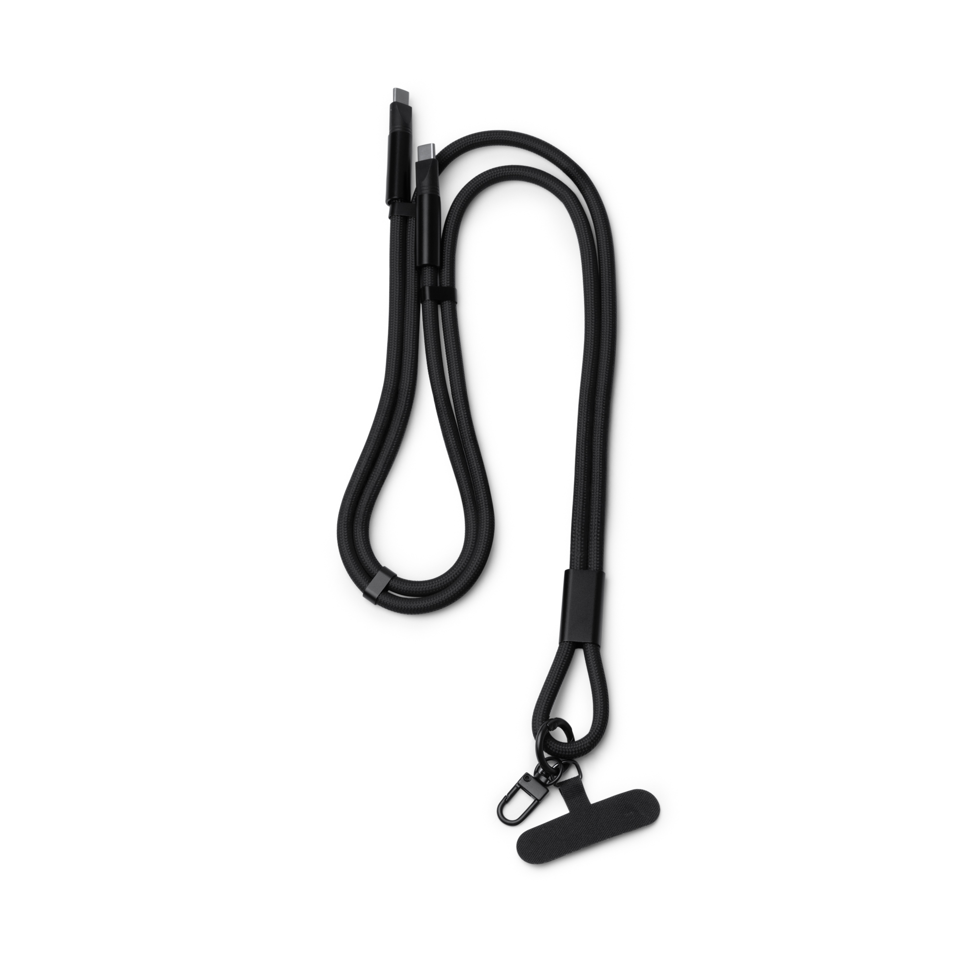 Landyard elaborado en nylon reciclado con función soporte para smartphone y cable de conexión Tipo C en ambos extremo. El cable sirve tanto a modo de conexión para carga como para transferencia de datos. Cuenta con un mosquetón pequeño en su extremo para transporte de otros objetos.