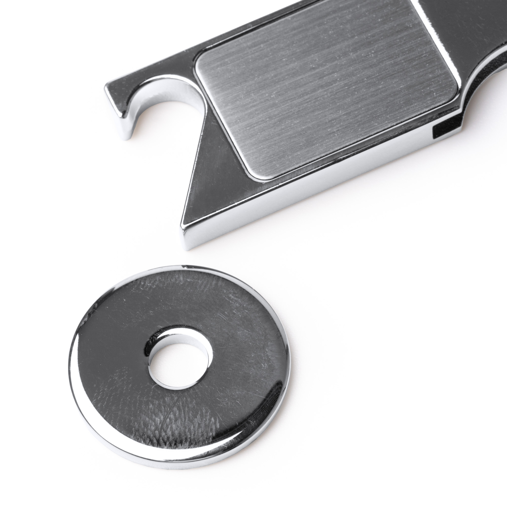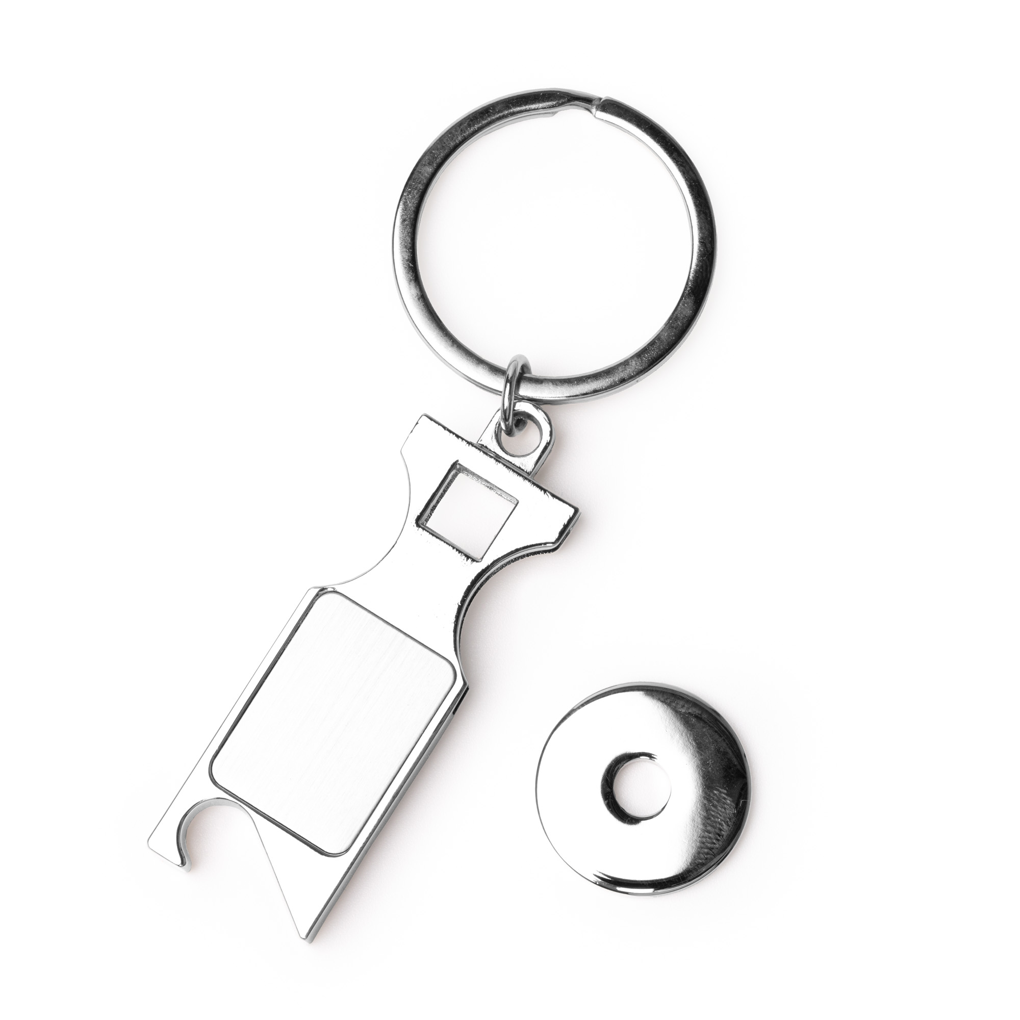 Llavero metálico con moneda extraíble para carro. La moneda puede extraerse por completo e insertarse en espacio diseñado para ello. Cuenta con abridor para botellas en su extremo.