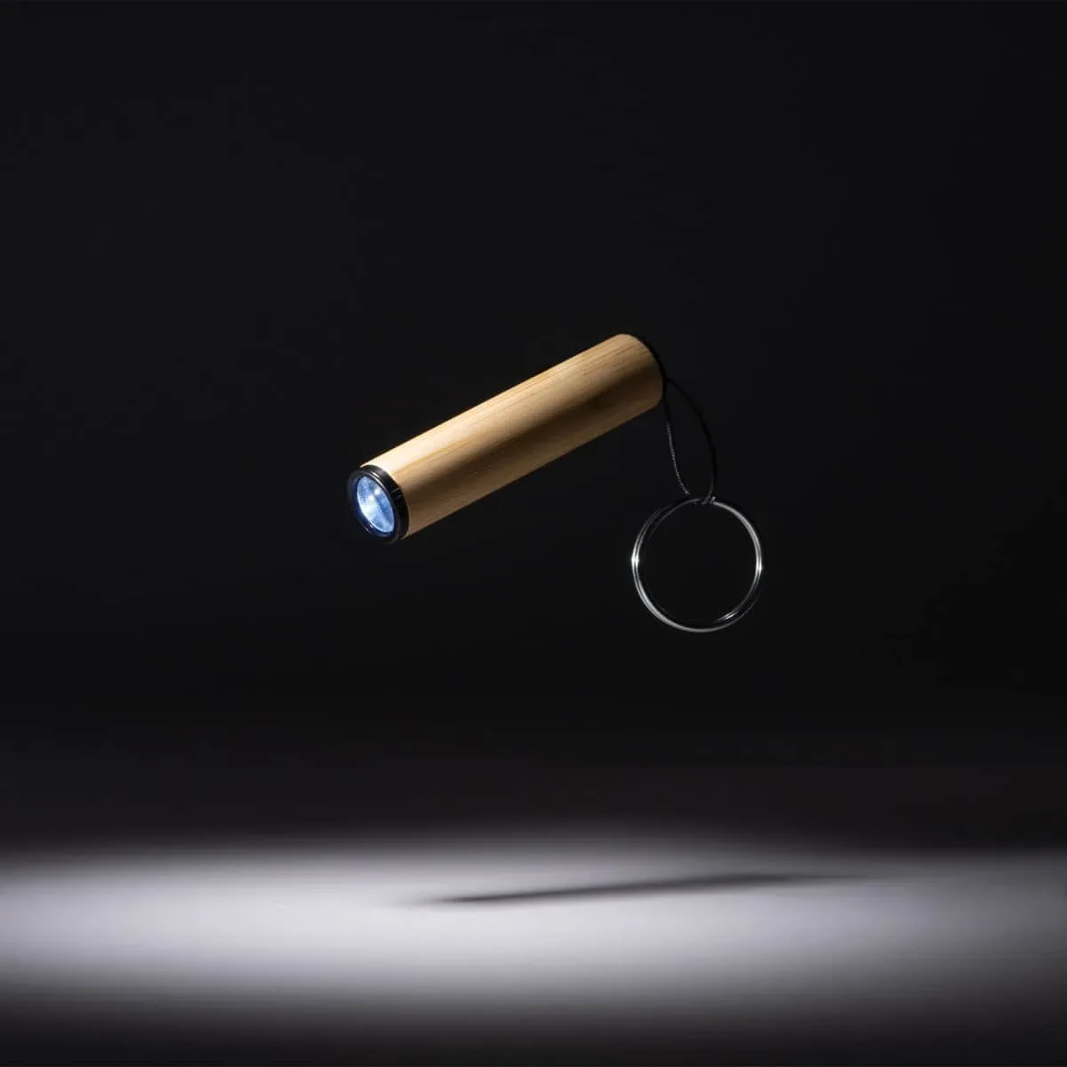 Llavero linterna con cuerpo elaborado en bambú, práctico, elegante y sostenible. Su diseño compacto y ligero que lo hace ideal para llevar en el bolsillo o colgarlo junto a las llaves. Incorpora una linterna LED que proporciona una iluminación brillante en situaciones de poca luz. Además, se incluyen tres pilas de botón LR41, lo que garantiza un uso inmediato.