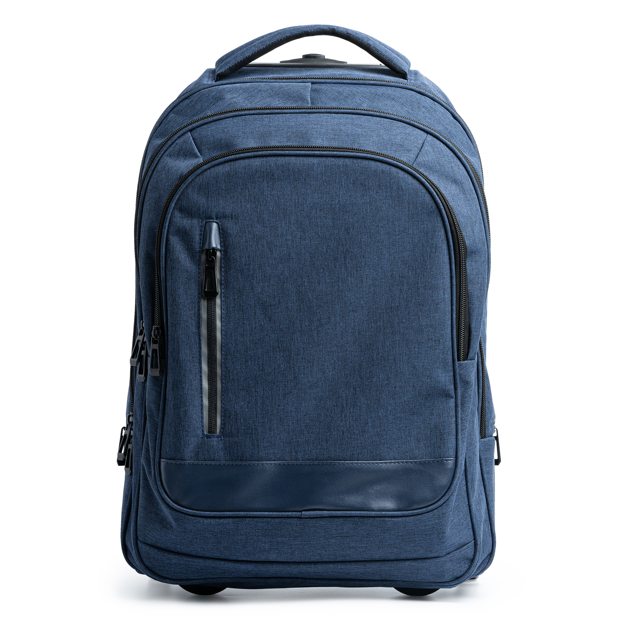Trolley convertible en mochila. Realizado en poliéster 300D vigoré. Bolsillo principal de gran capacidad con compartimento interior acolchado ideal para portátil de hasta 17″. Dos bolsillos con compartimentos interiores y bolsillo frontal. Estructura de alta calidad y resistencia. Tiras acolchadas ajustables. Fundas cubre ruedas antimanchas. Apta para cabina.