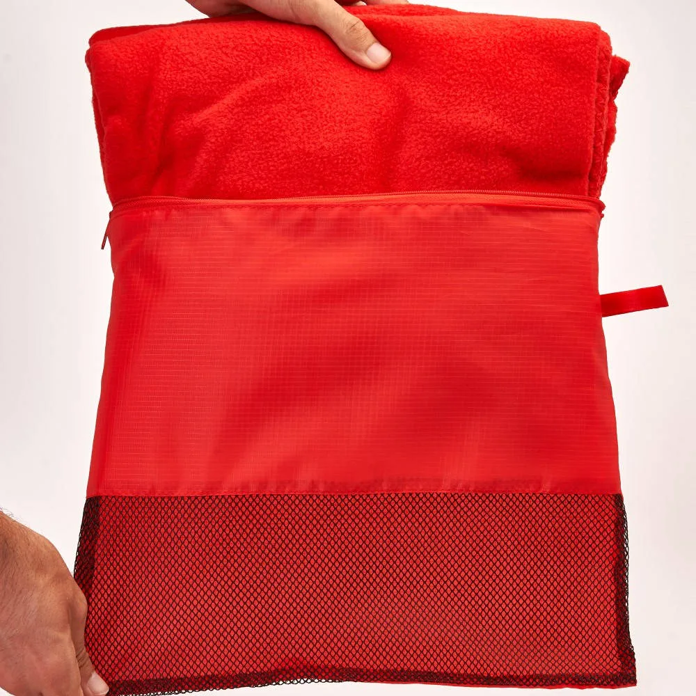 Manta de forro polar de 200 g/m² en color liso con funda a juego. Tratamiento anti-pilling en uno de los lados. Funda rectangular realizada en poliéster tela Oxford y rejilla, con cremallera del mismo color.