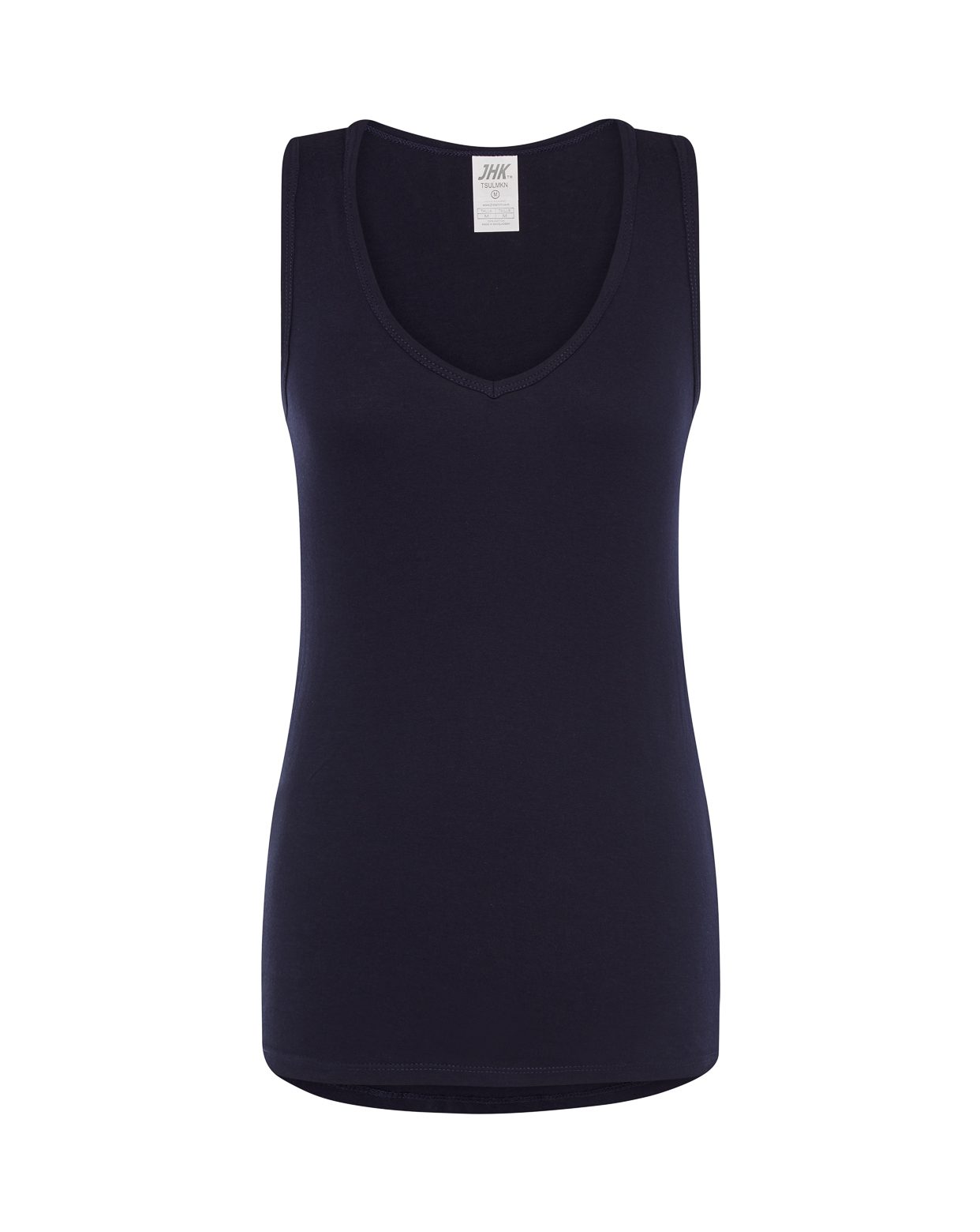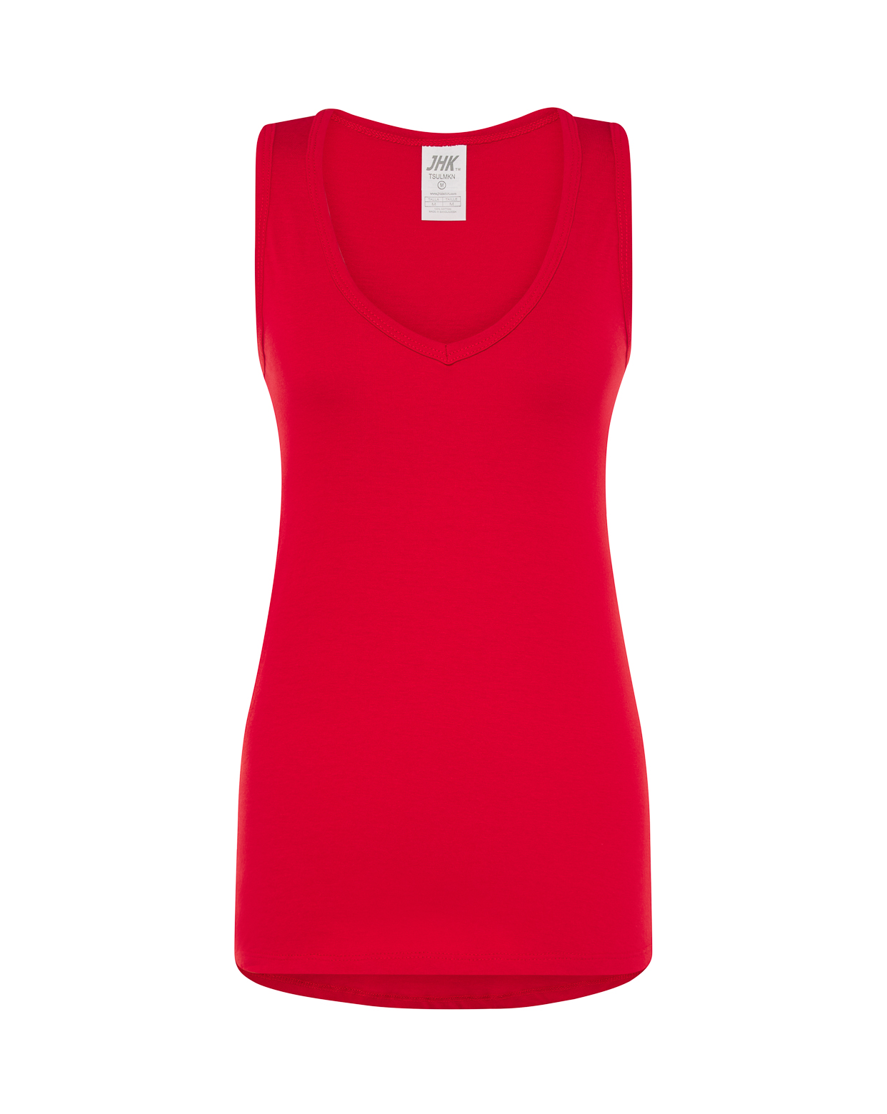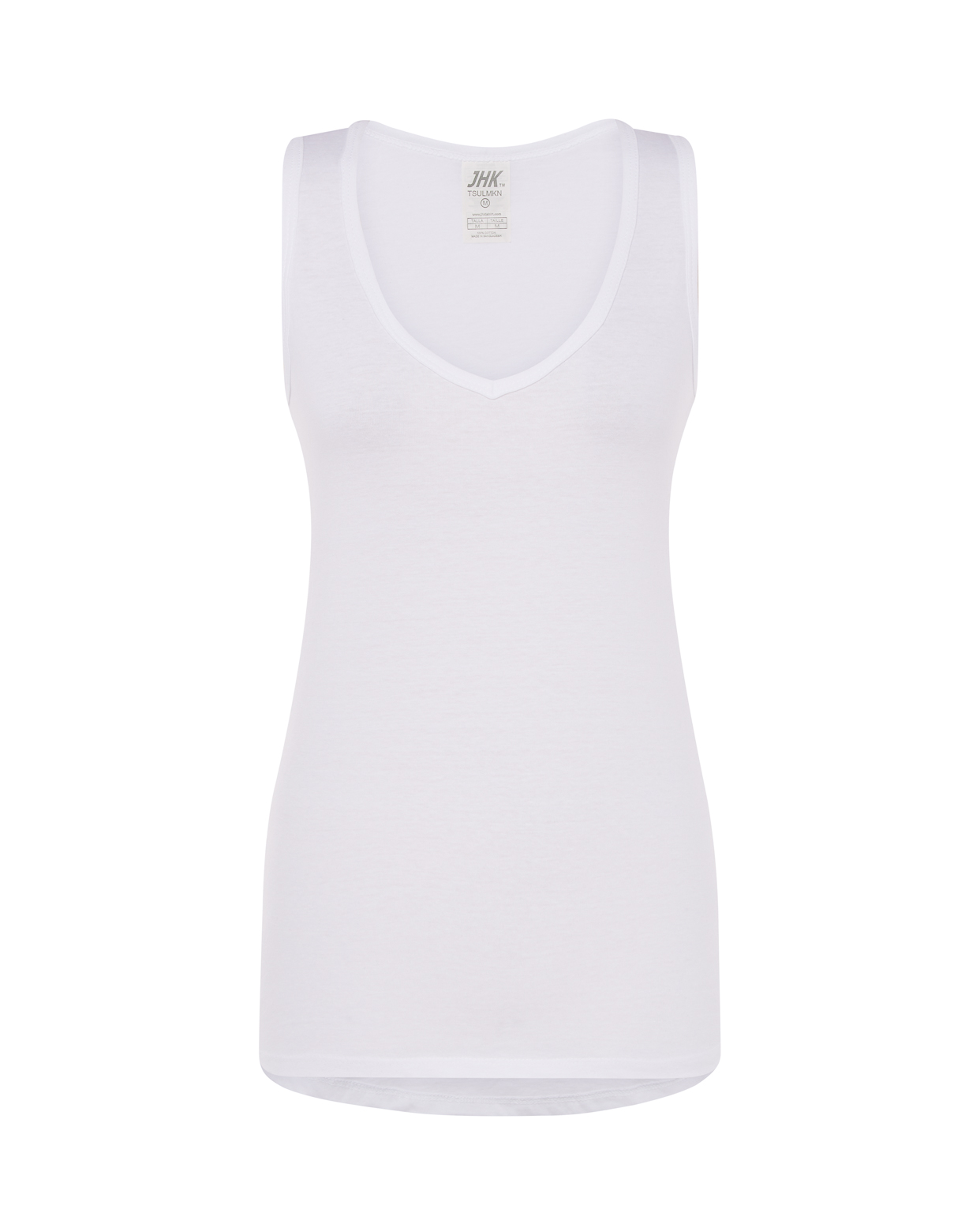 Camiseta sin mangas de mujer con cuello de pico, parte trasera más larga, 100% algodón. Etiqueta removible.