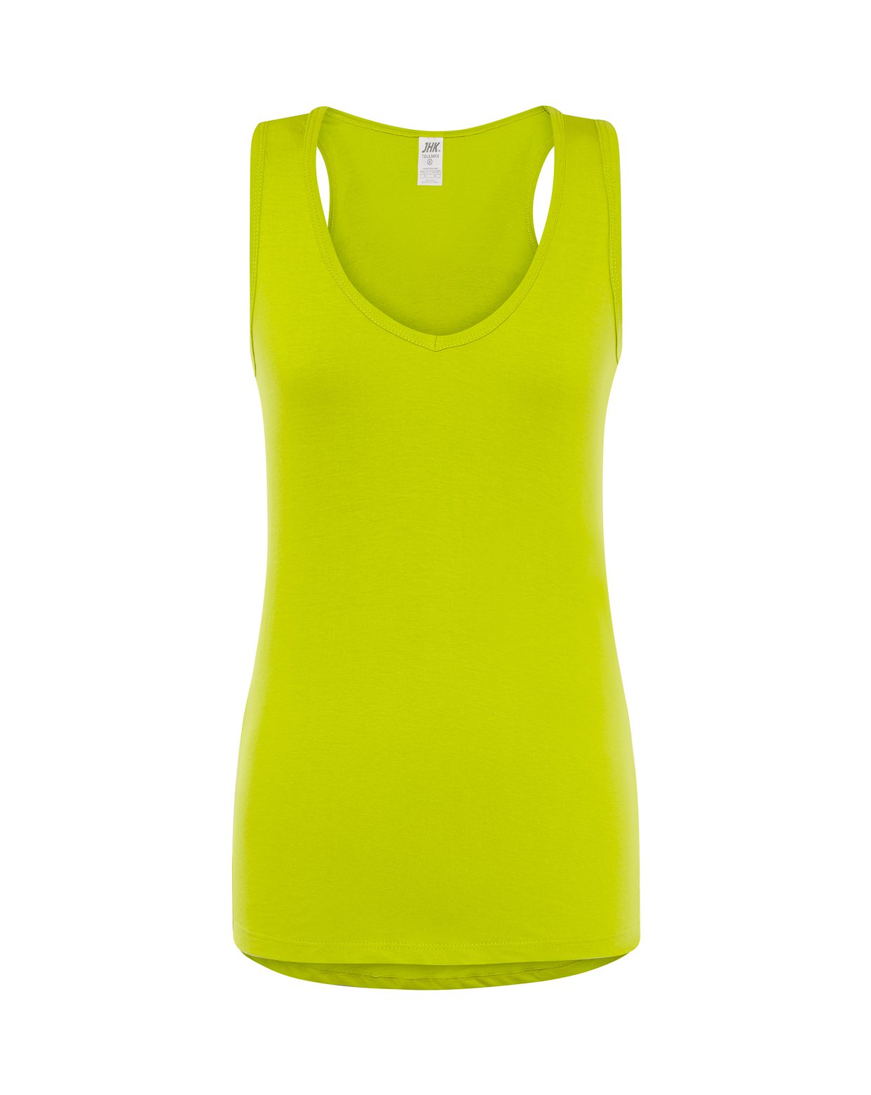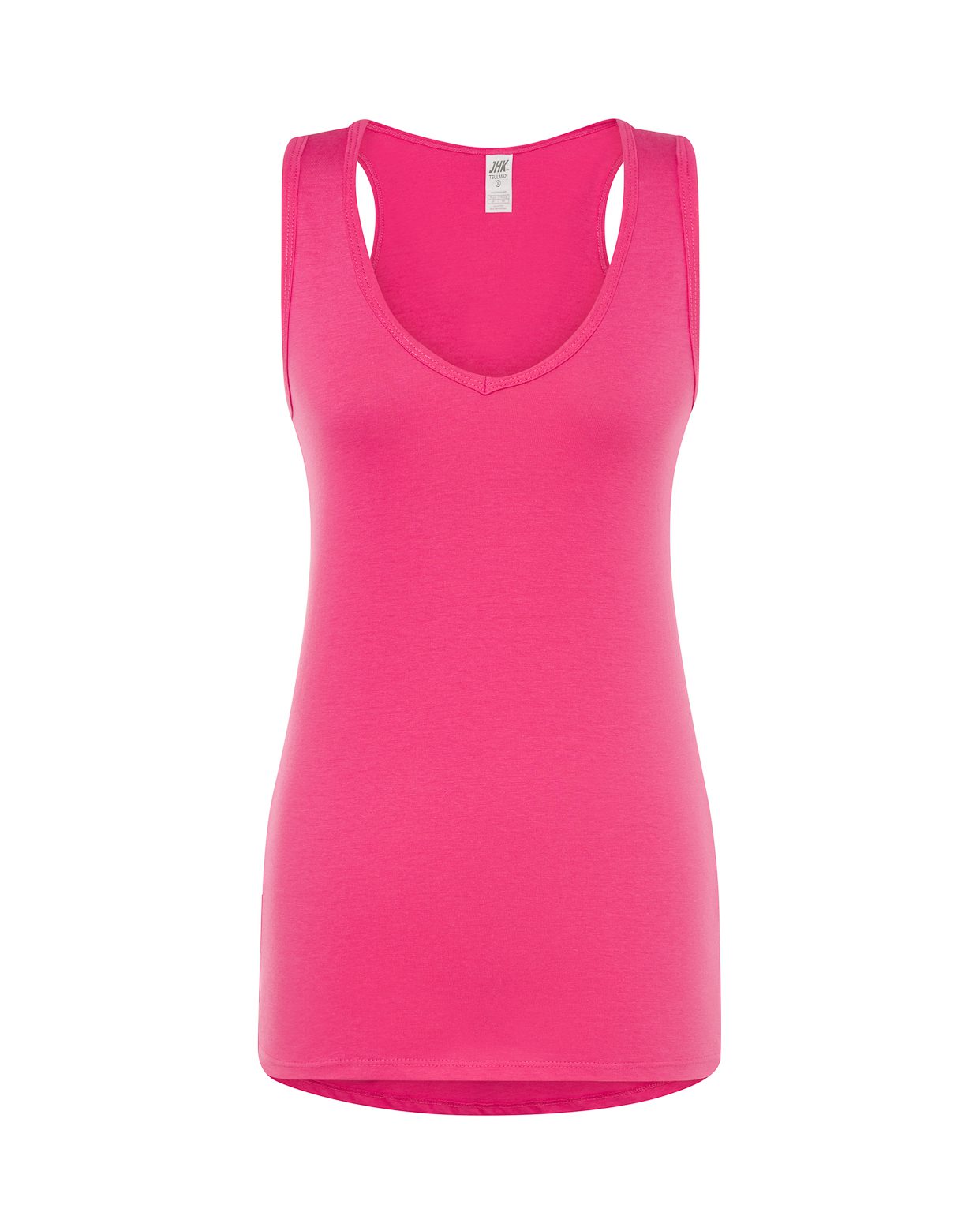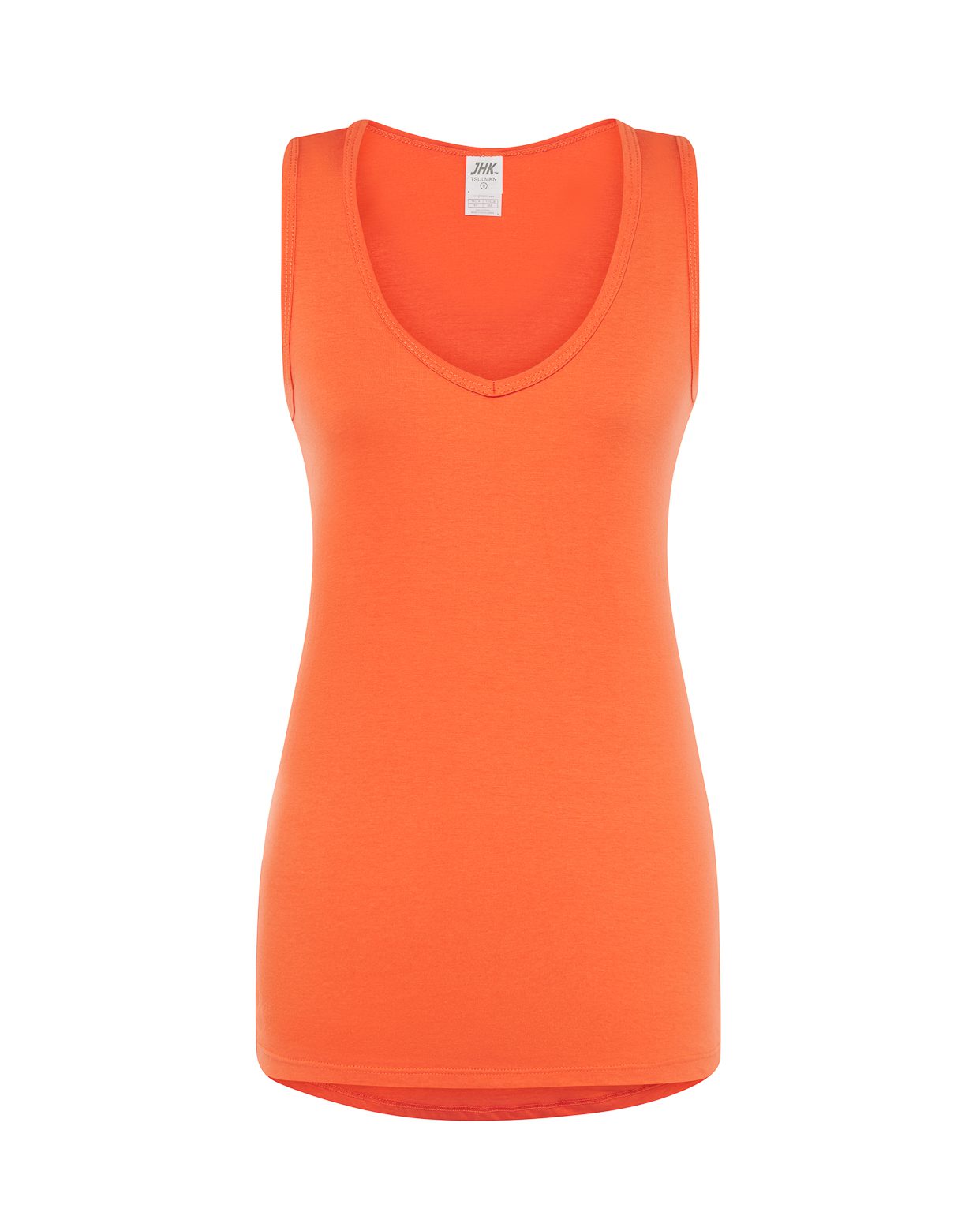 Camiseta sin mangas de mujer con cuello de pico, parte trasera más larga, 100% algodón. Etiqueta removible.
