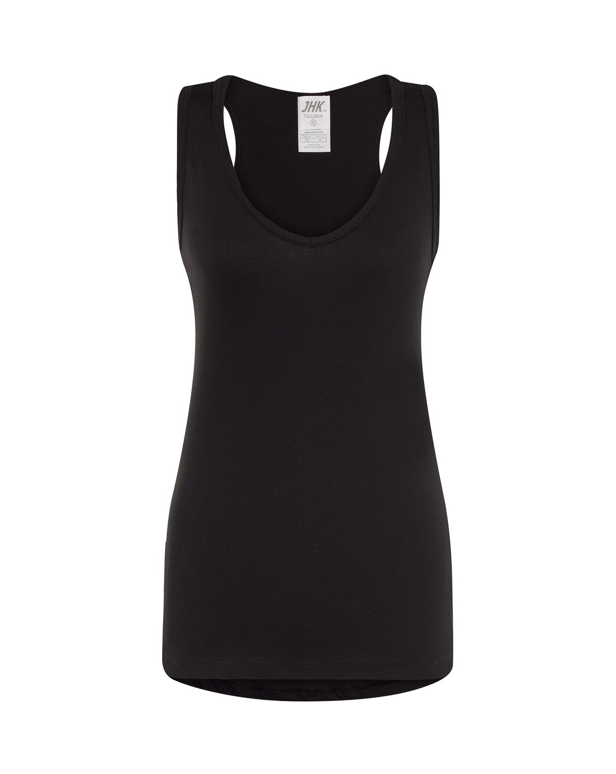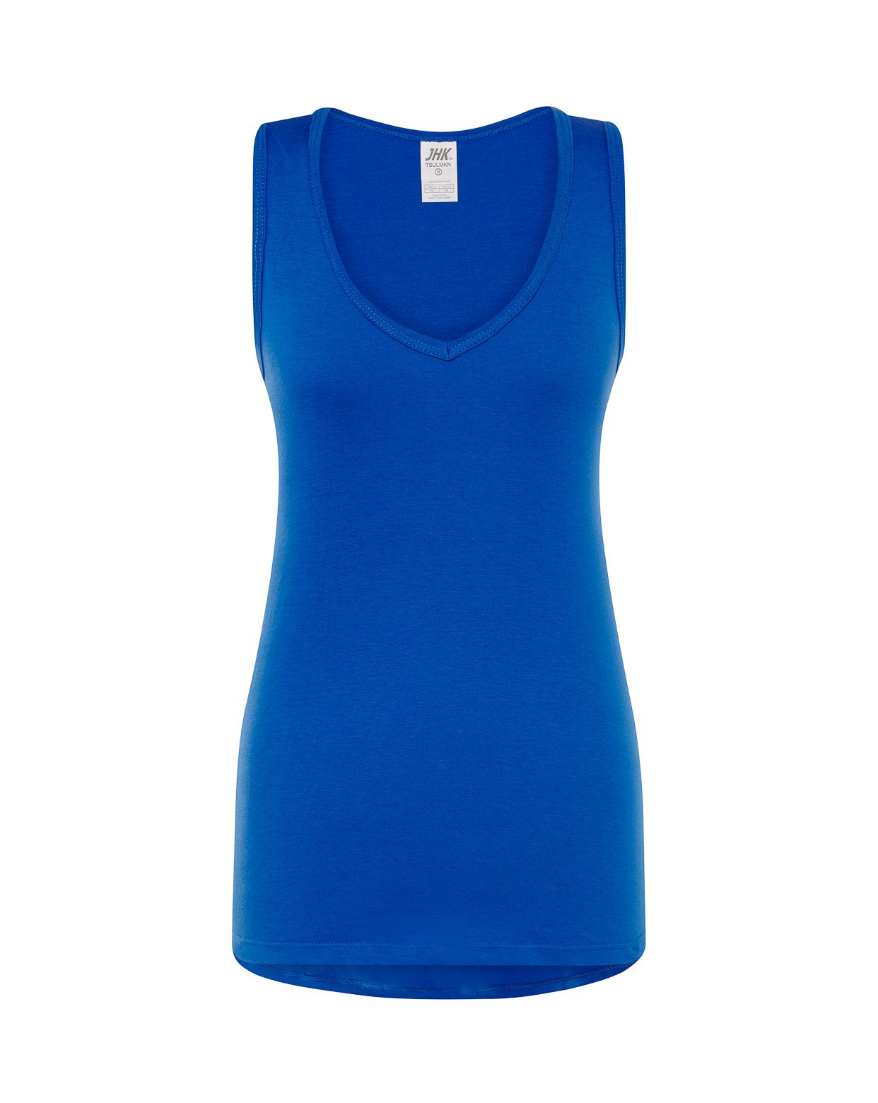 Camiseta sin mangas de mujer con cuello de pico, parte trasera más larga, 100% algodón. Etiqueta removible. Disponible en 8 colores y desde la talla S hasta la XL.