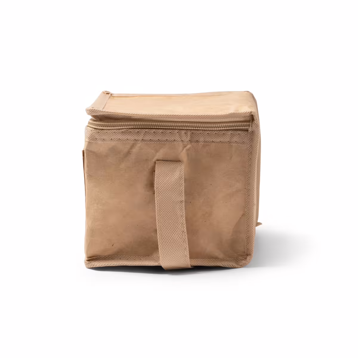 PRODUCTO QUE SE DESCATALOGARÁ CUANDO SE AGOTEN LAS EXISTENCIAS – Nevera de papel kraft laminada, con interior isotérmico de aluminio y espuma aislante de 2 mm, permitiendo mantener los alimentos y bebidas en una temperatura perfecta. Cuenta con una solapa con cierre de cremallera y práctica asa de mano para transporte.