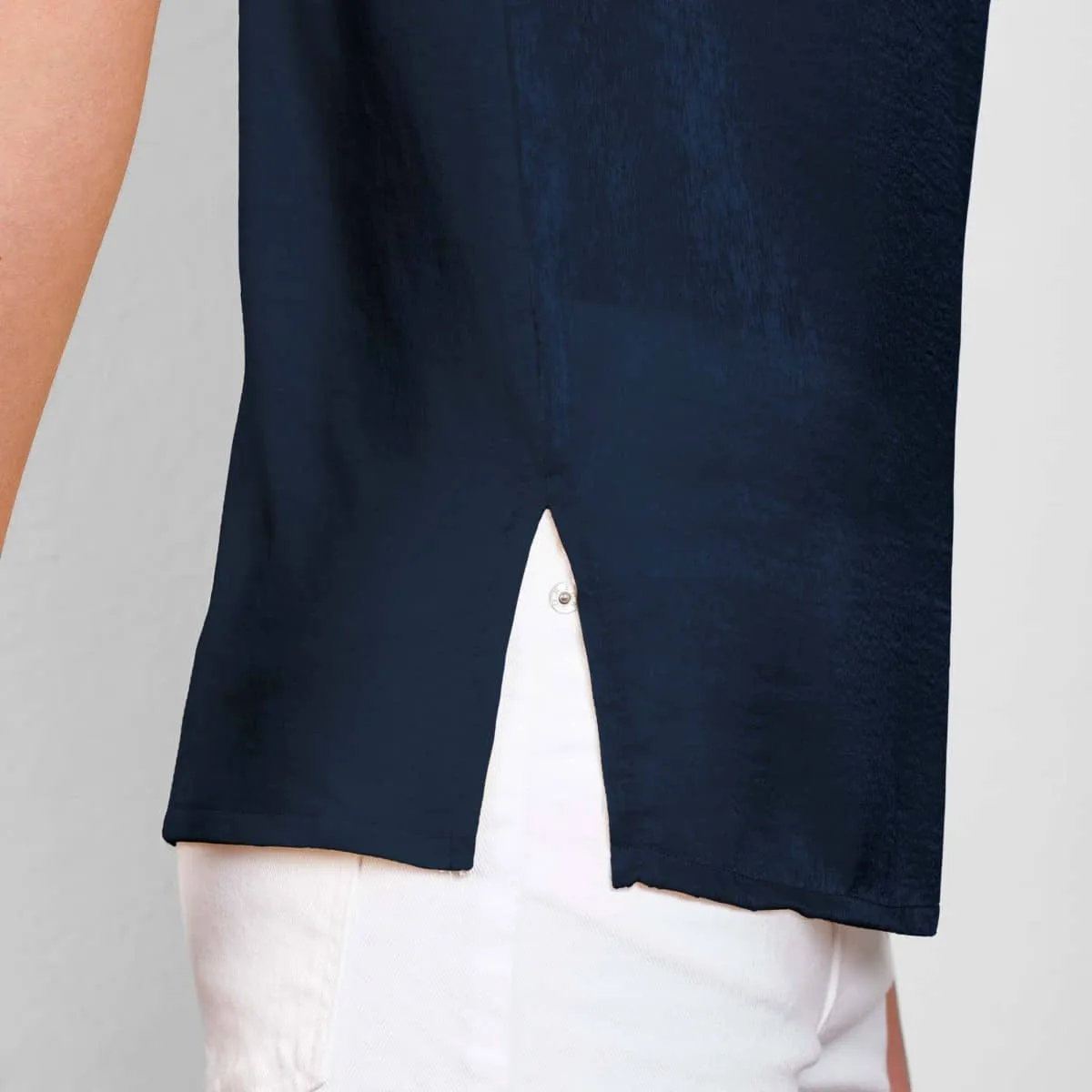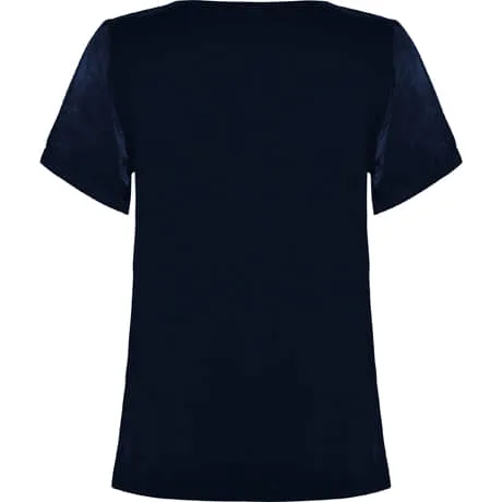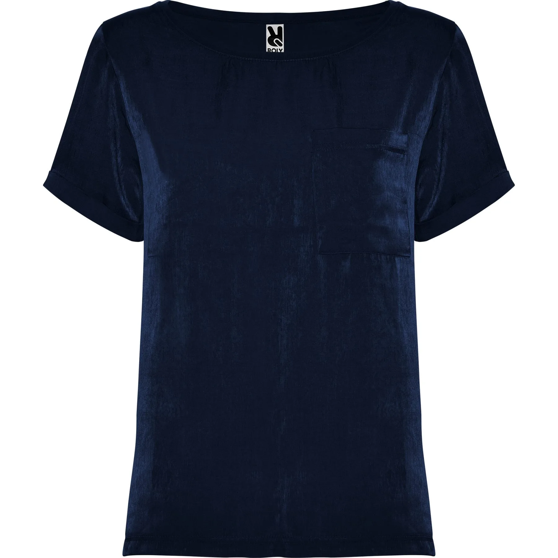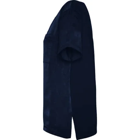 Camiseta de mujer de manga corta y escote amplio. Bolsillo en pecho izquierdo. El patronaje de la espalda es ligeramente más largo que el delantero, con aperturas laterales en el bajo.