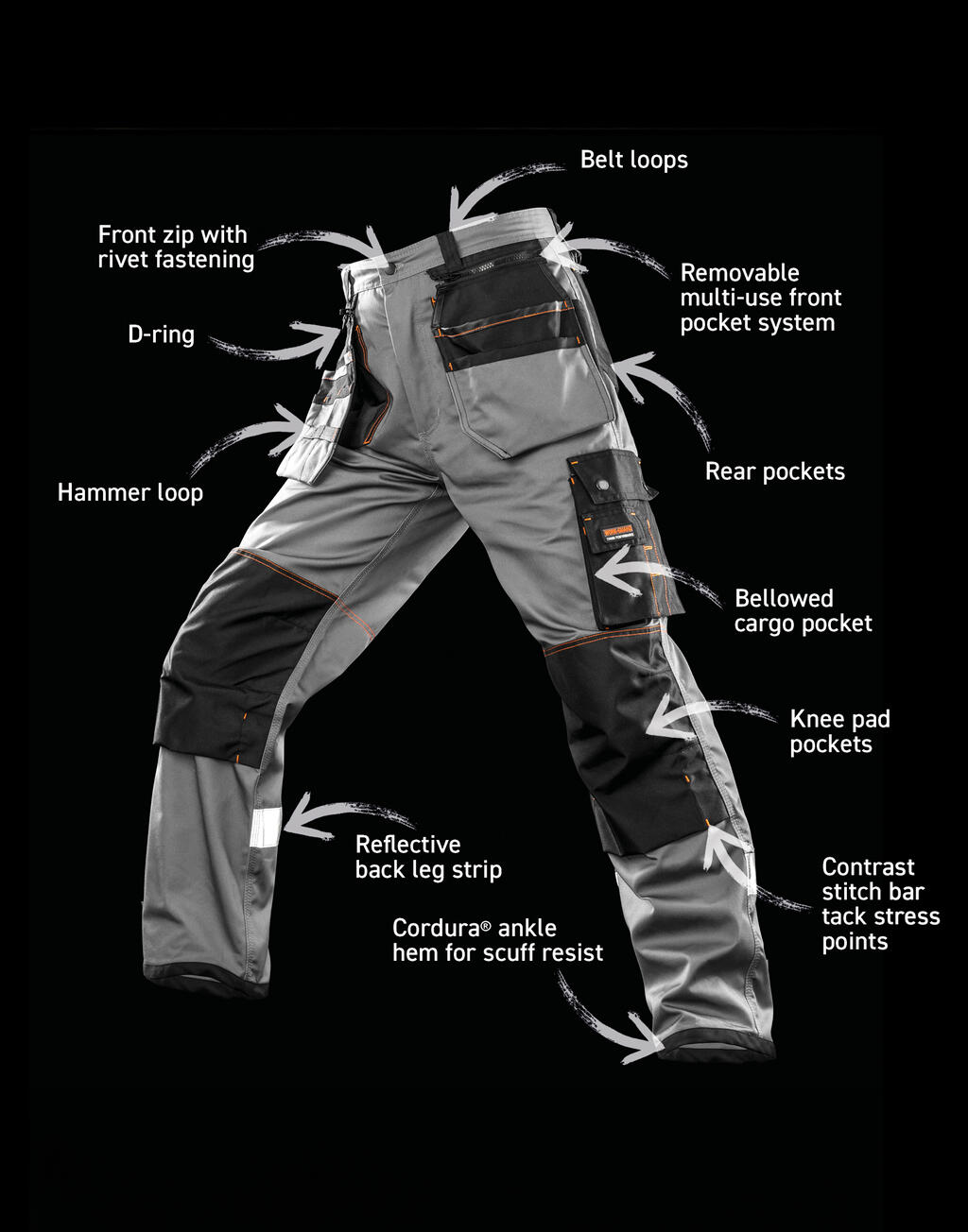 - Bolsillos cargo, anilla en forma de D,porta martillo