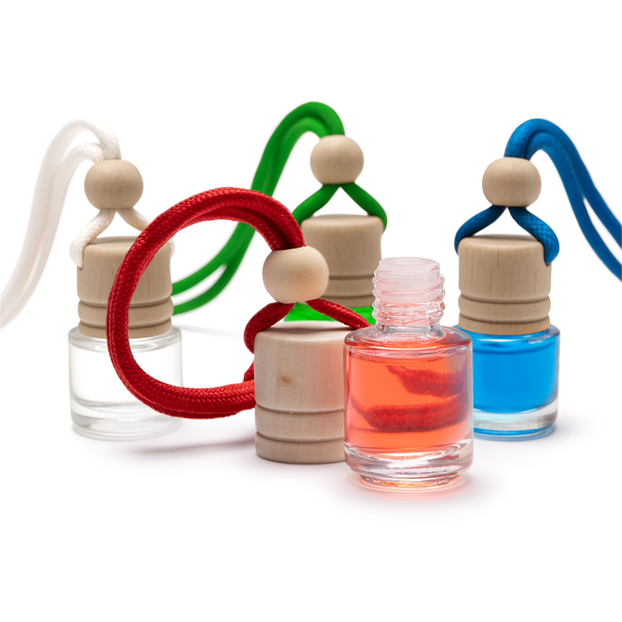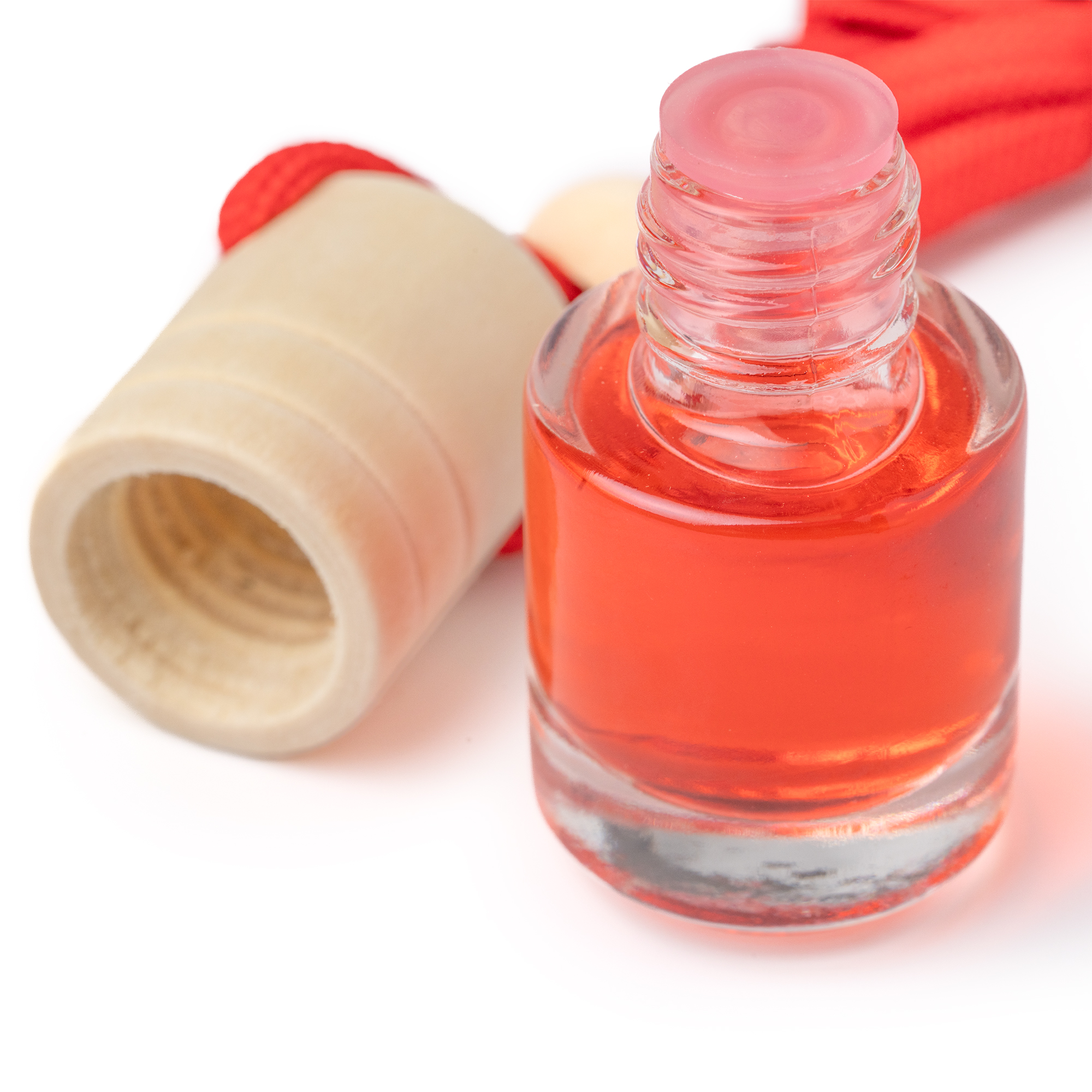 Ambientador de diferentes aromas (Lavanda, pino, océano y frutos rojos), en bote de cristal con tapón de madera y cordón de ajuste a juego. Capacidad 5 ml.