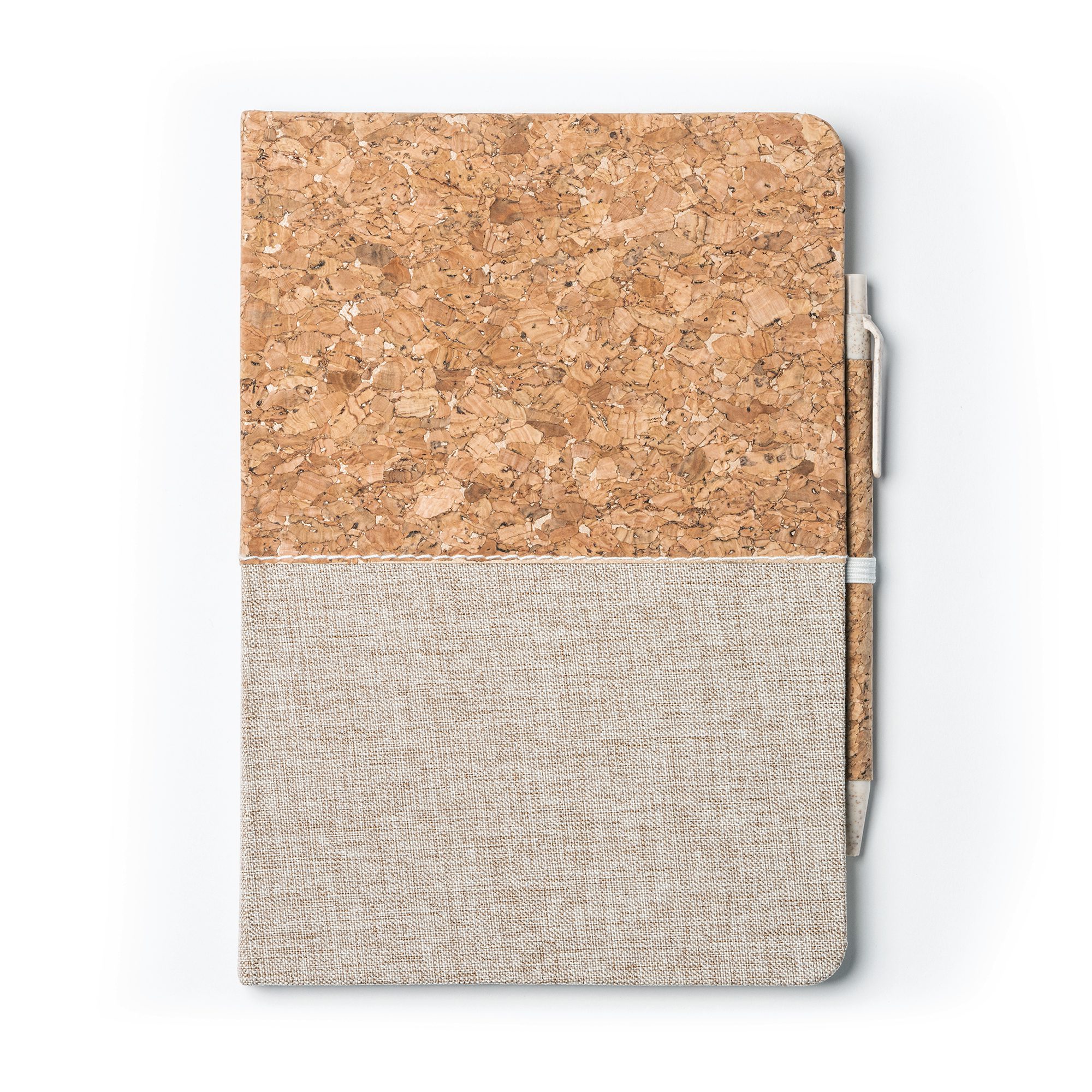 Bloc de notas A5 con tapas rígidas de corcho y algodón. 80 hojas lisas. Incluye soporte con bolígrafo de corcho y fibra de trigo a juego.