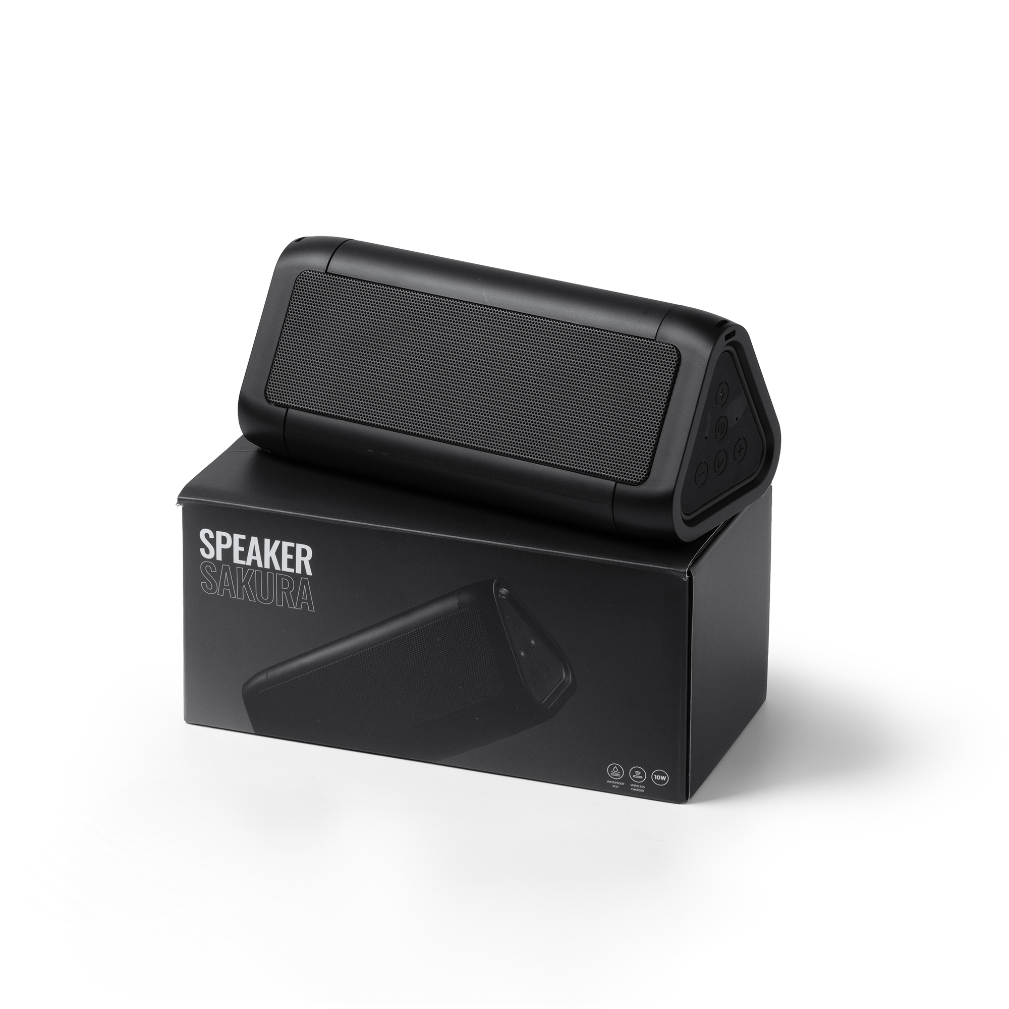 Altavoz Bluetooth realizado en material resistente al agua, con potencia de 10W. Cuenta con un tiempo de funcionamiento continuo de hasta 8 horas. Con función de carga inalámbrica de 5W para dispositivos provistos de esta tecnología y función manos libres, con botones multifunción de control de llamada y micrófono incorporado. Incluye indicador luminoso de carga y soporte para móvil en la parte posterior.