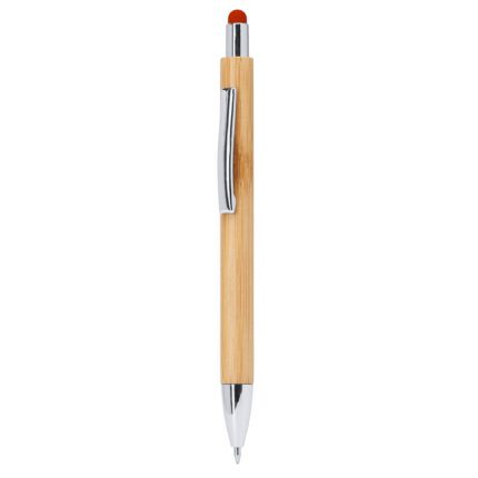 Bolígrafo línea eco con cuerpo de bambú, puntero táctil de color y clip metálico. Pulsador, clip y punta plateados.